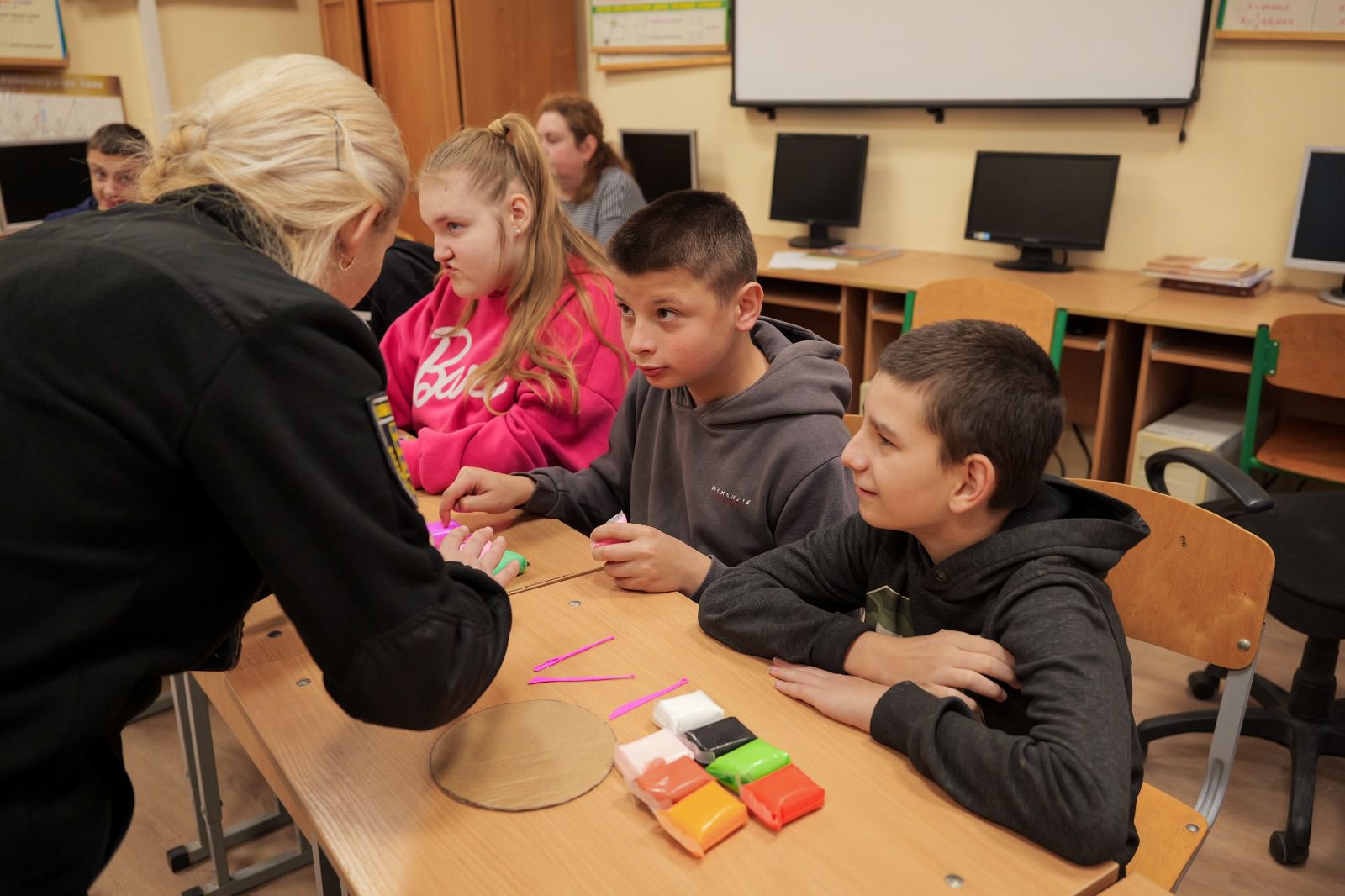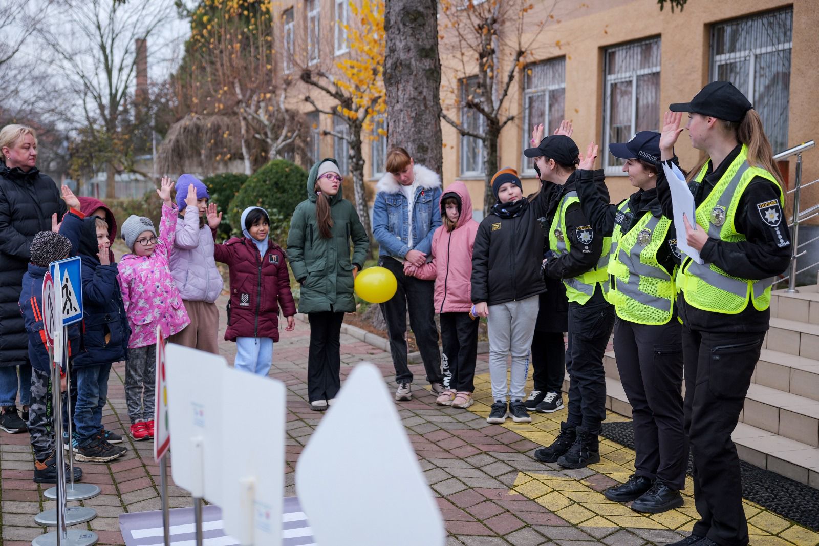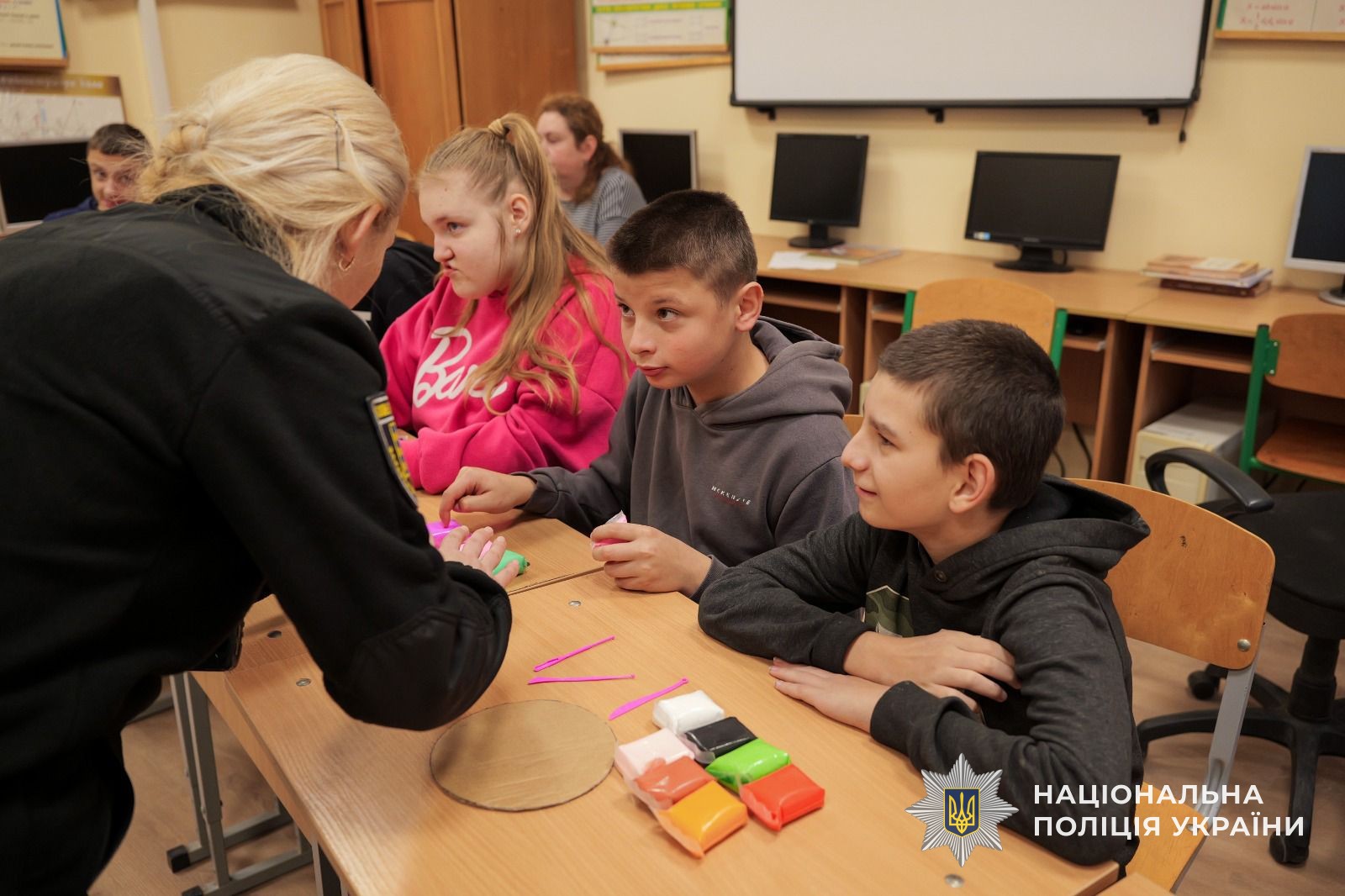 Учні 5-7 класів спільно з інспекторами виготовляли фігурки з повітряного пластиліну на патріотичну тематику, а для учнів 8–9 класів правоохоронці організували динамічну руханку з використанням флікерів – важливого елемента безпеки на дорозі.