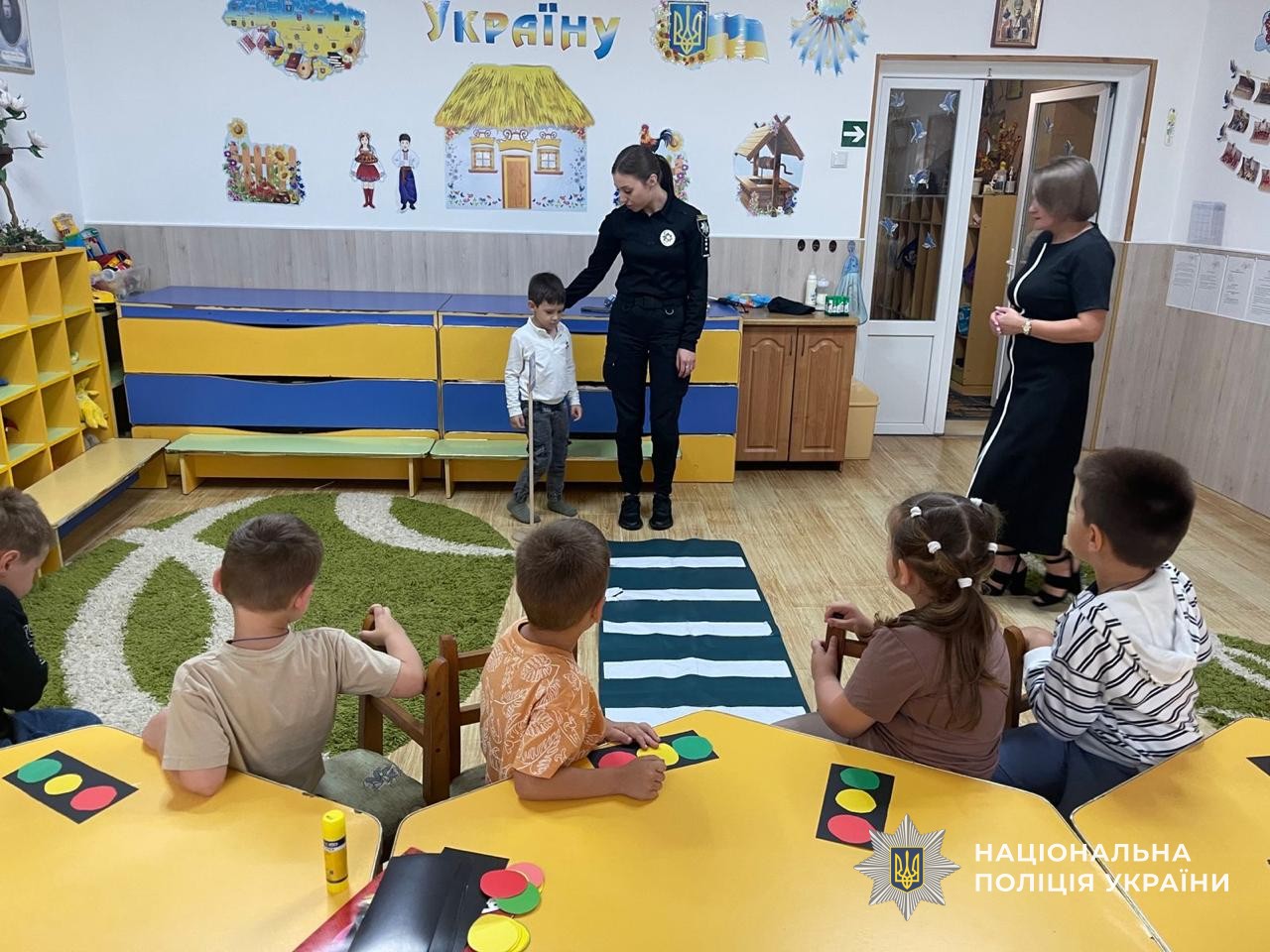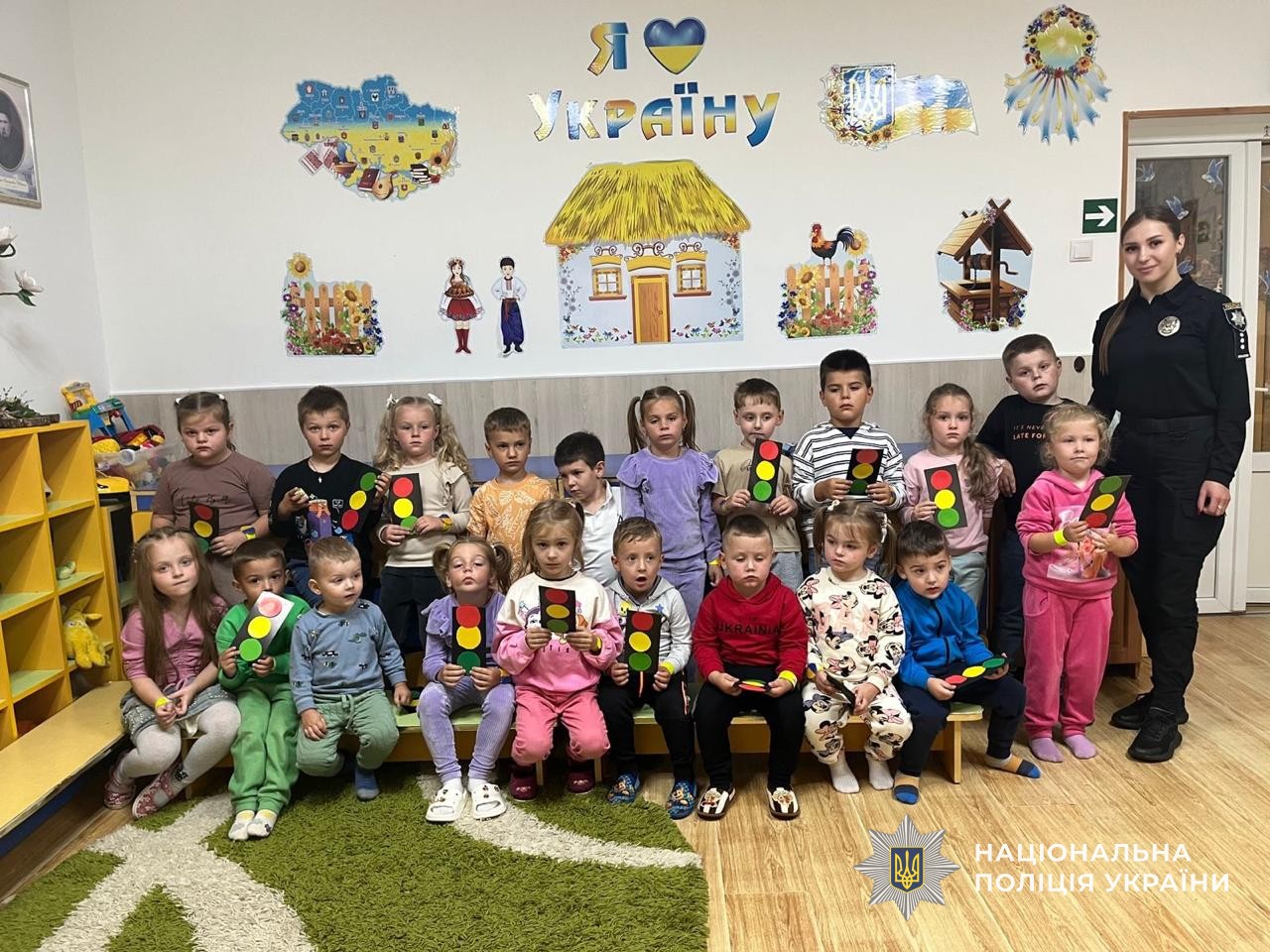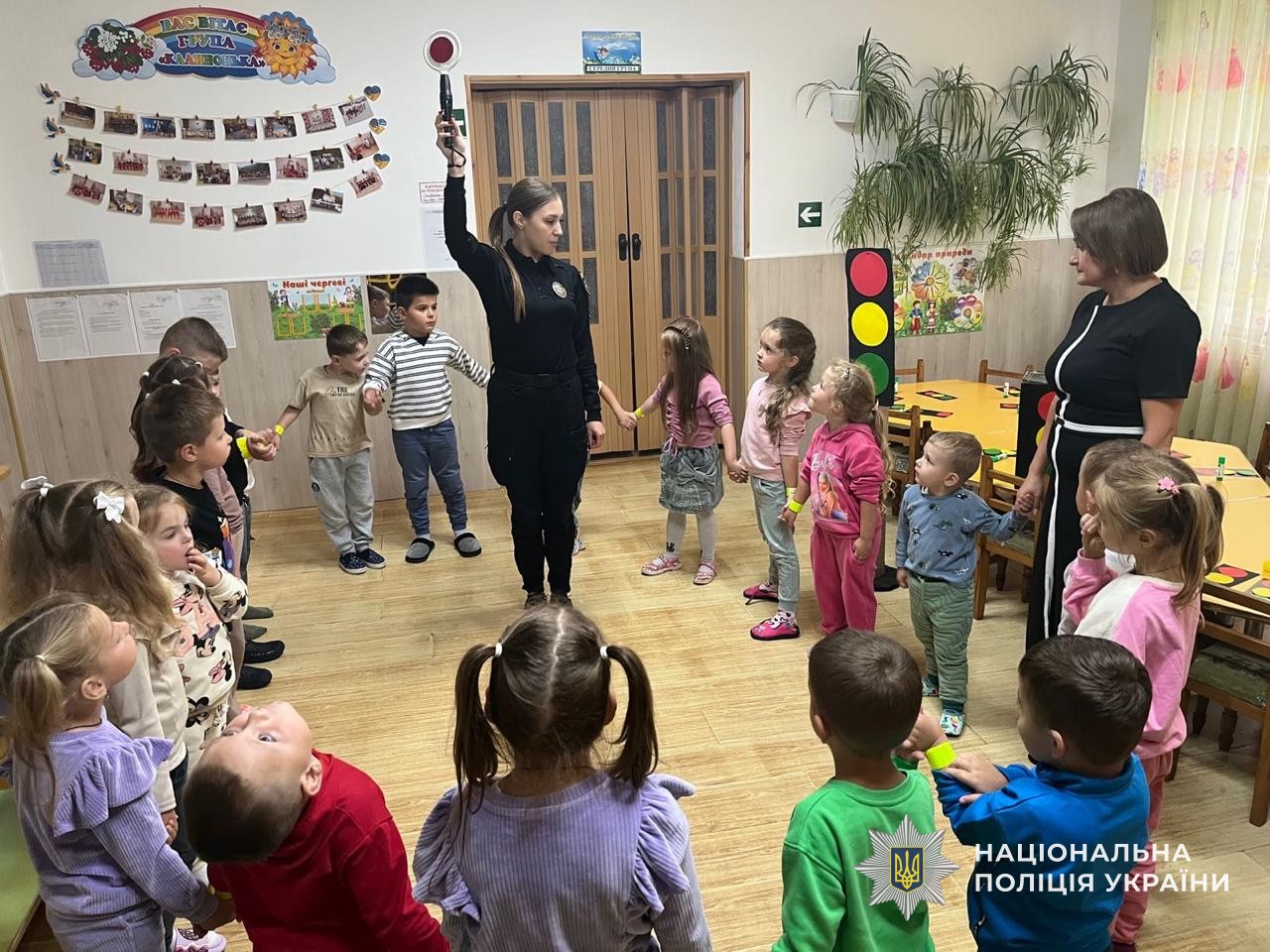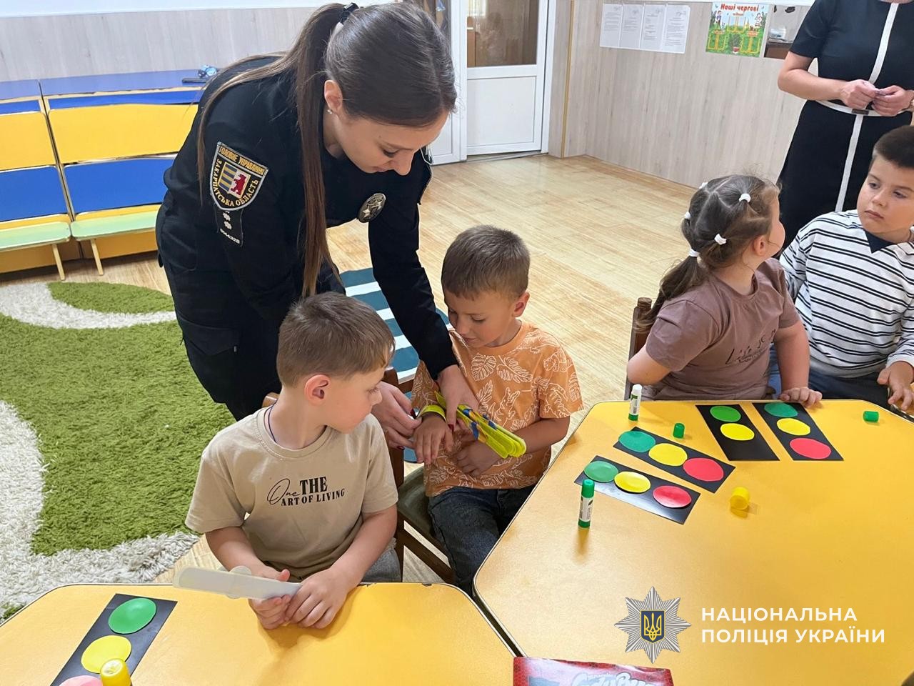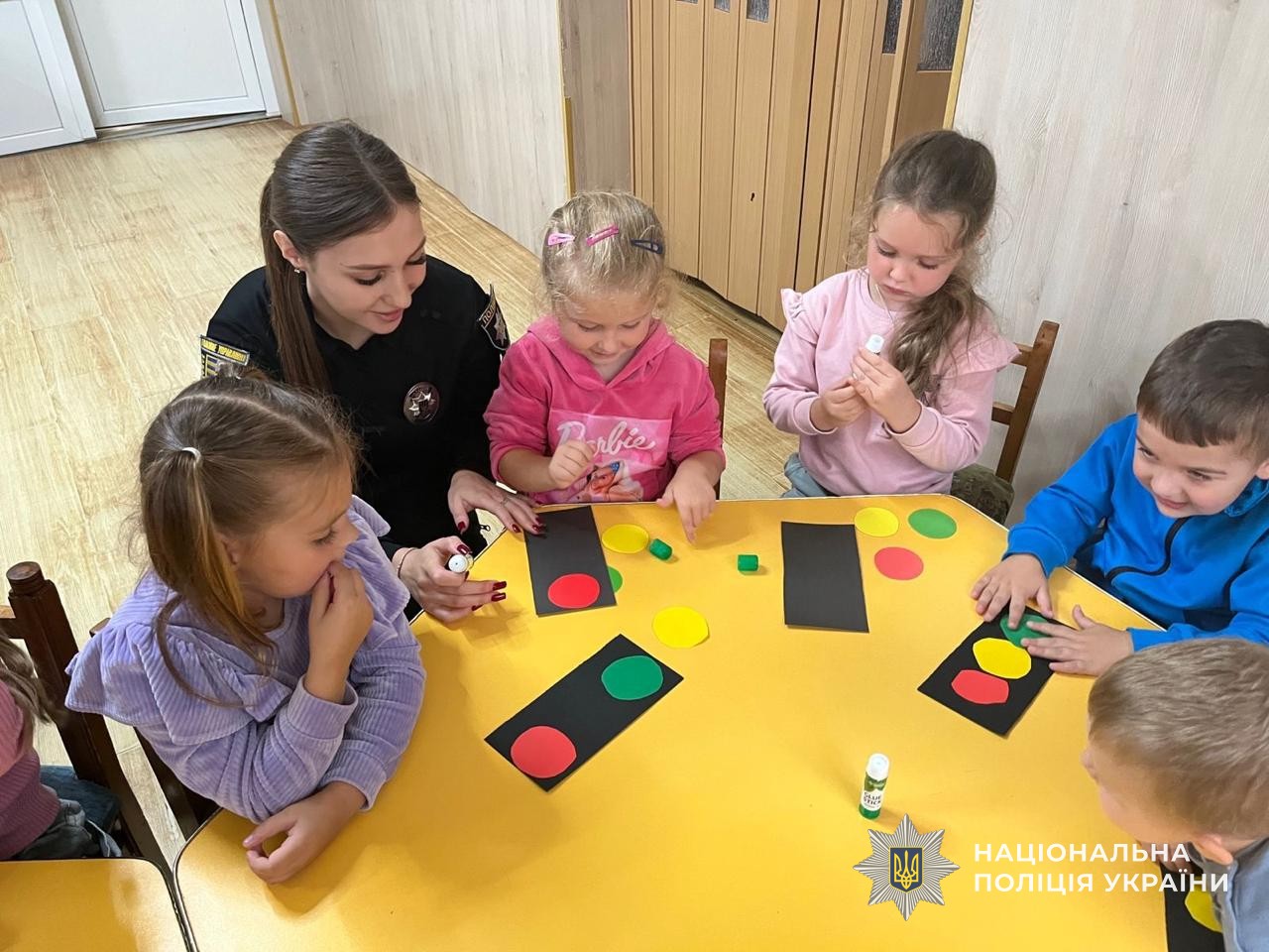 Разом із вихованцями правоохоронниця вирізала з паперу світлофори, нагадала значення кольорів та організувала гру «Світлофор». Діти також повторили дорожні знаки та вчилися правильно переходити пішохідний перехід, аби знання закріпилися у практичній формі.