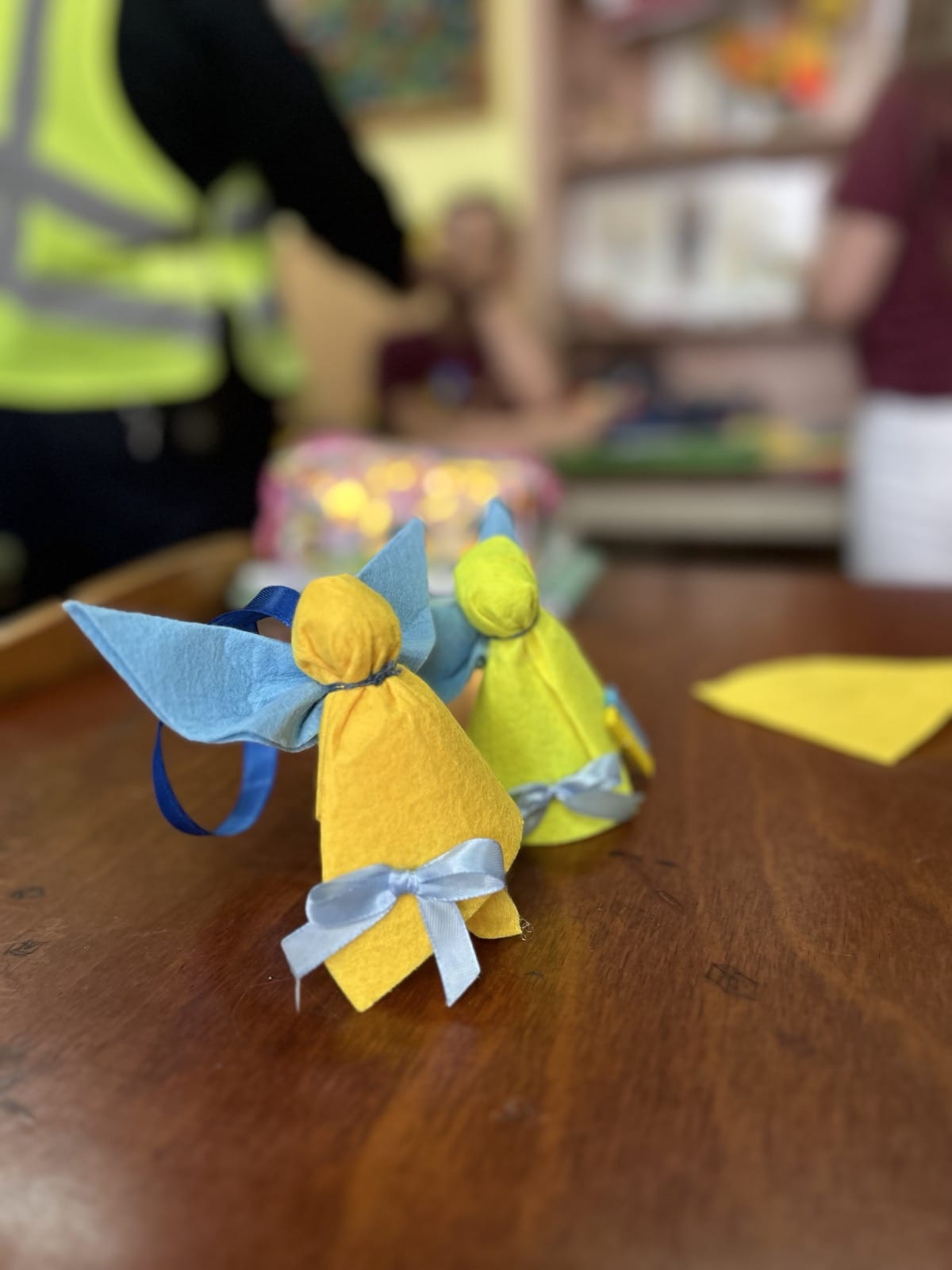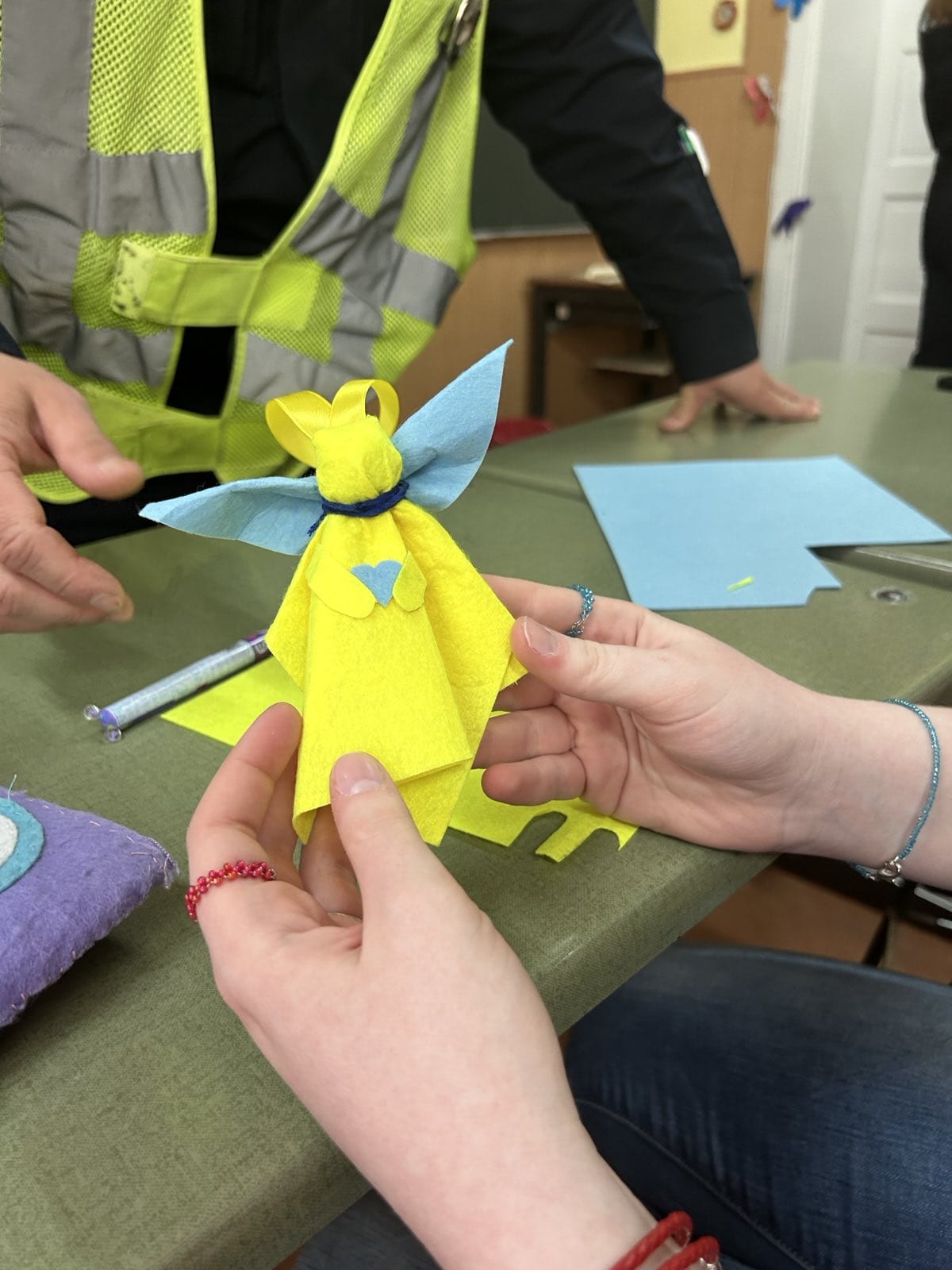 Хлопці та дівчата спільно з поліцейськими дбайливо вирізали та скріплювали фетрові елементи мотанок-янголів у синьо-жовтій кольоровій гамі. А потім разом оздоблювали їх декоративними деталями з шовкових стрічок.