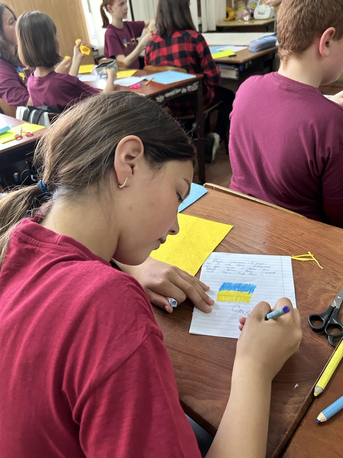 Разом із малюнками діти передали ювеналам синьо-жовті стяги із написами-побажаннями.