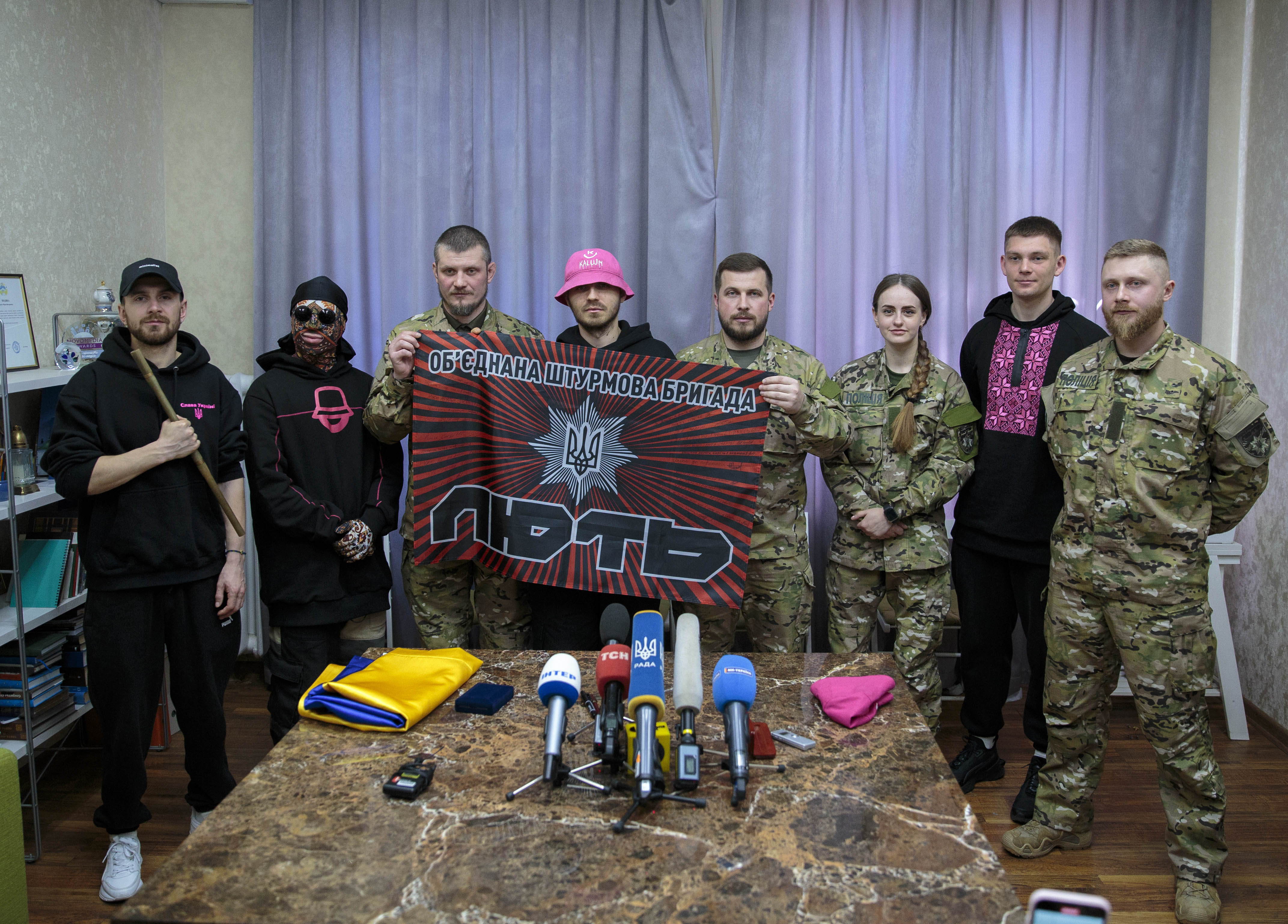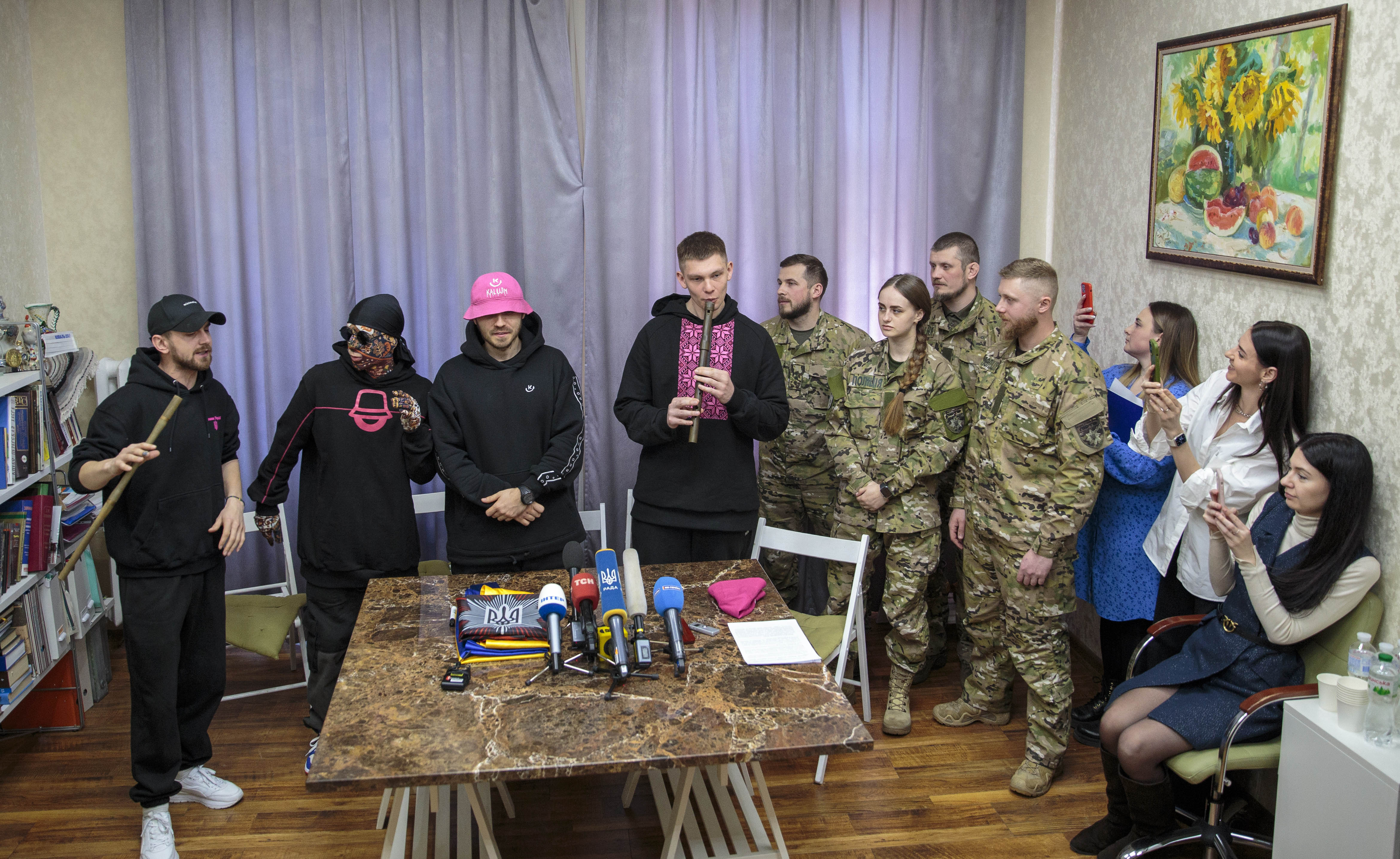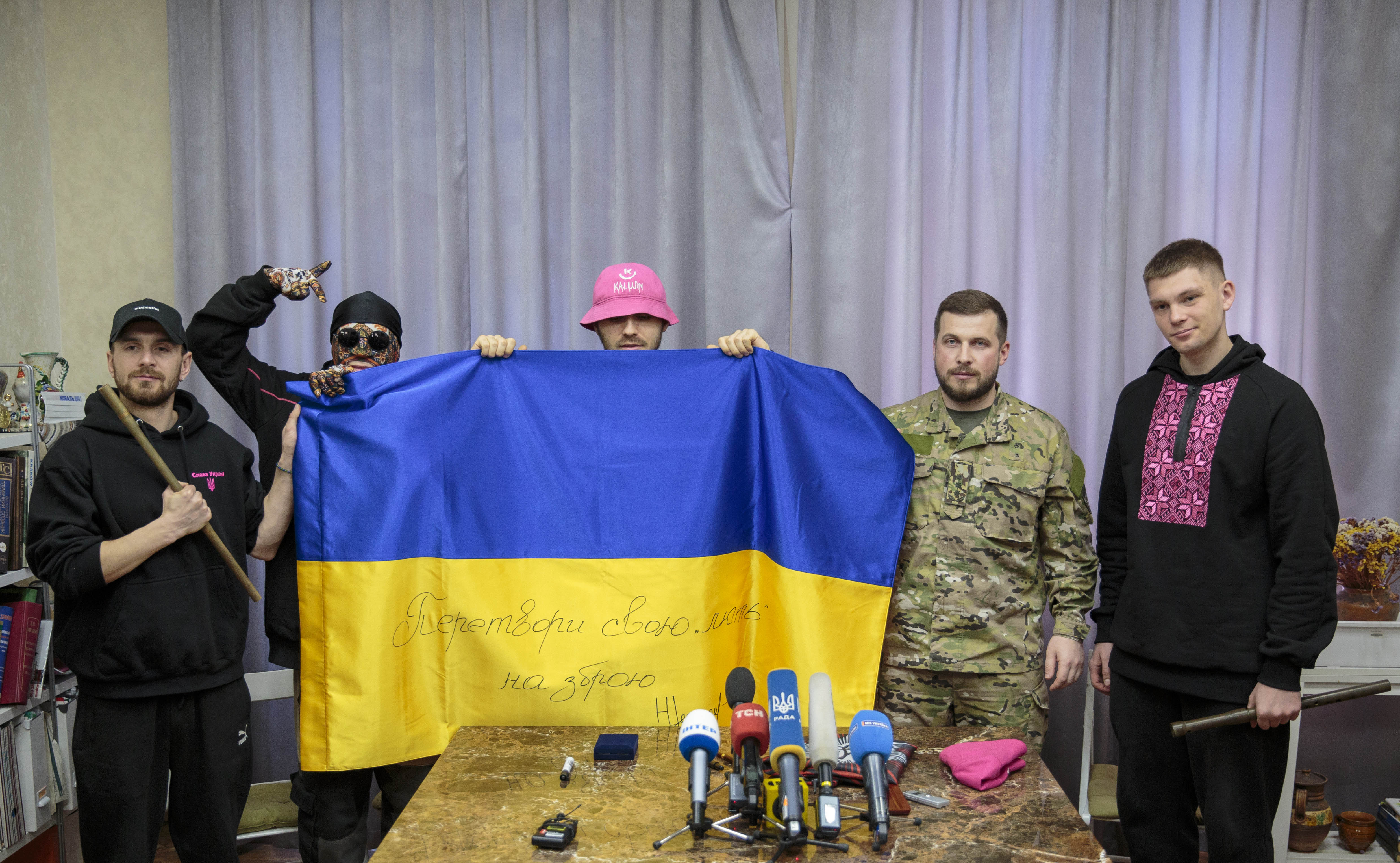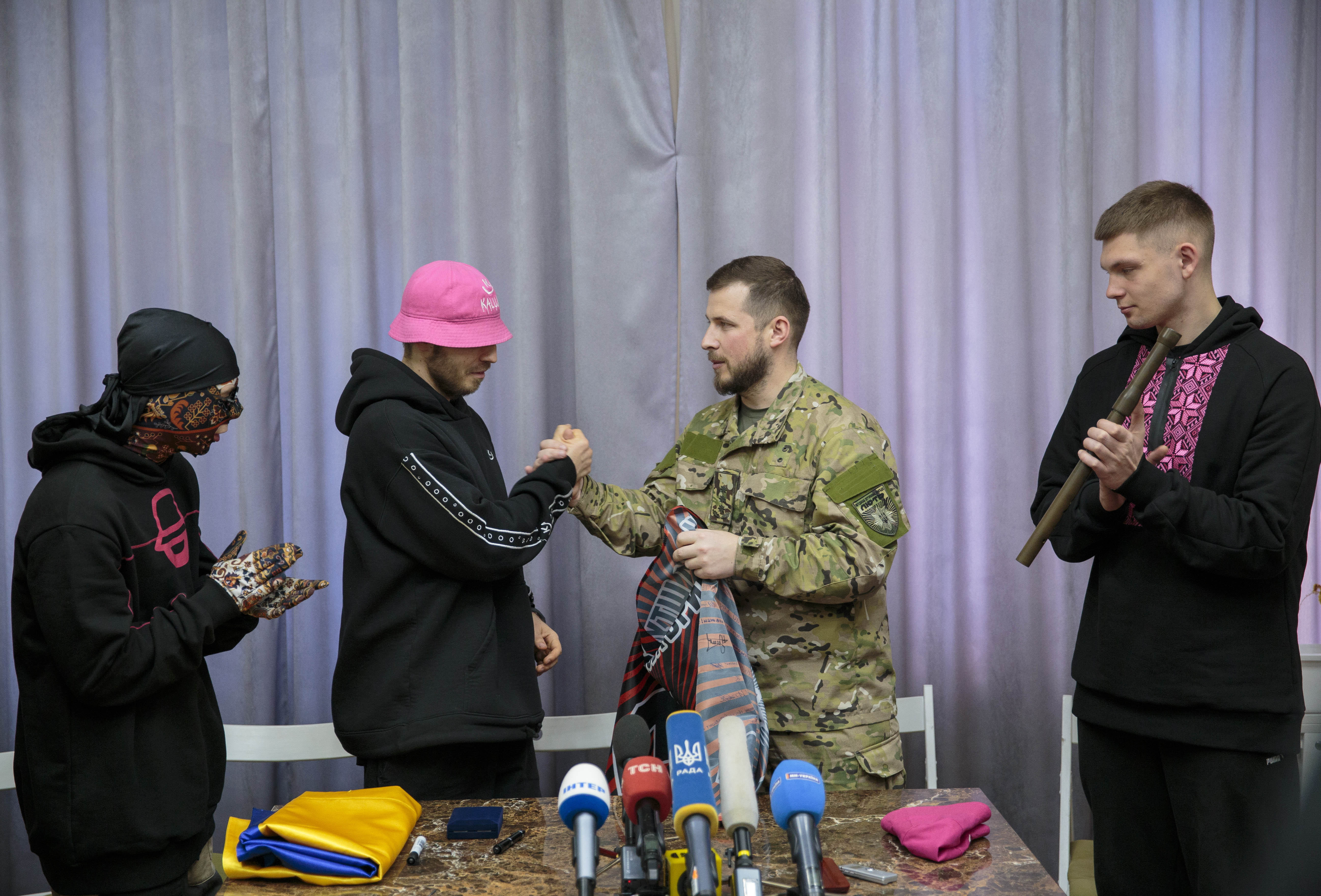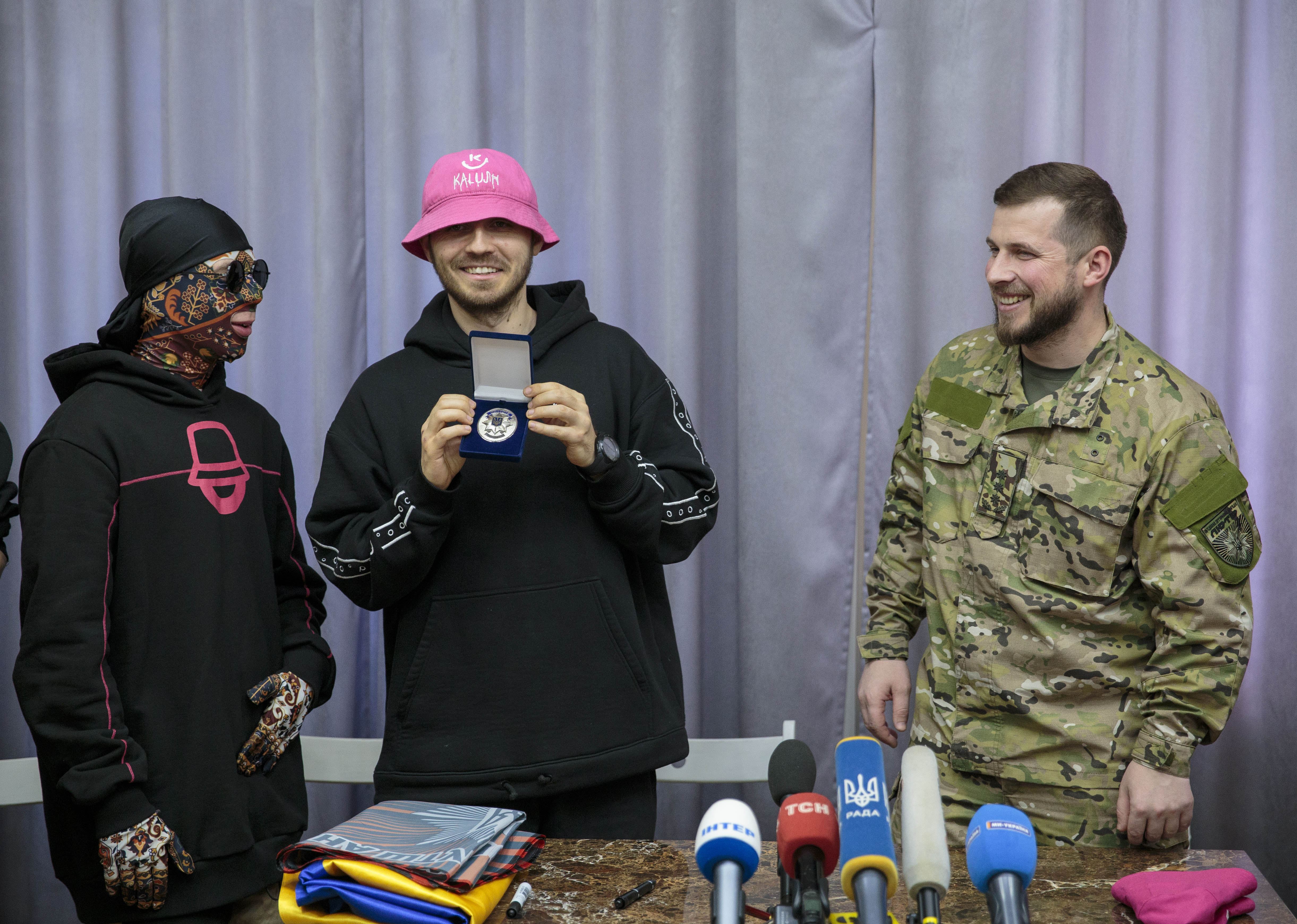 Фронтмен гурту Олег Псюк на знак підтримки передав бійцям бригади знамениту рожеву панаму з підписами учасників «Kalush Orchestra», яка також стала символом «Євробачення-2022»: