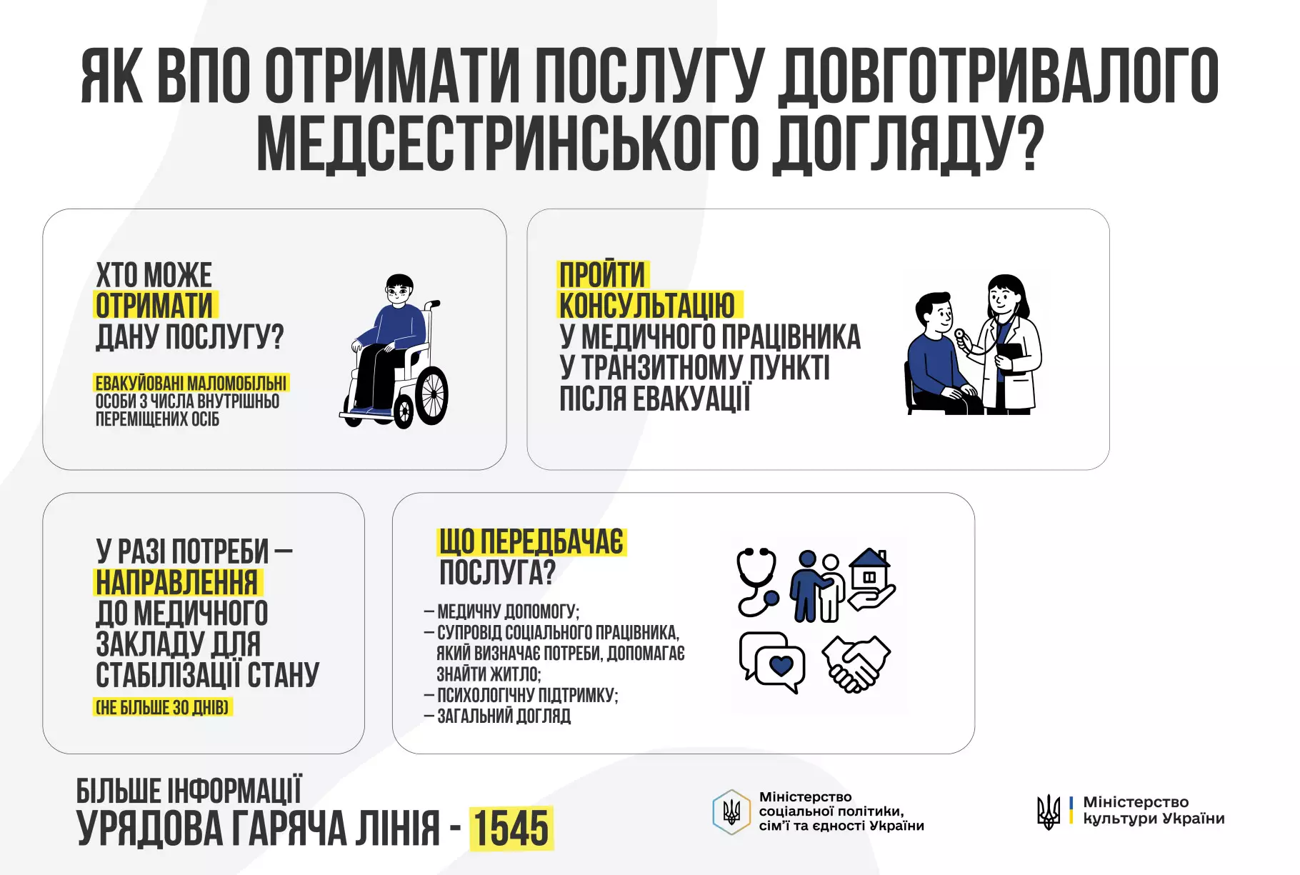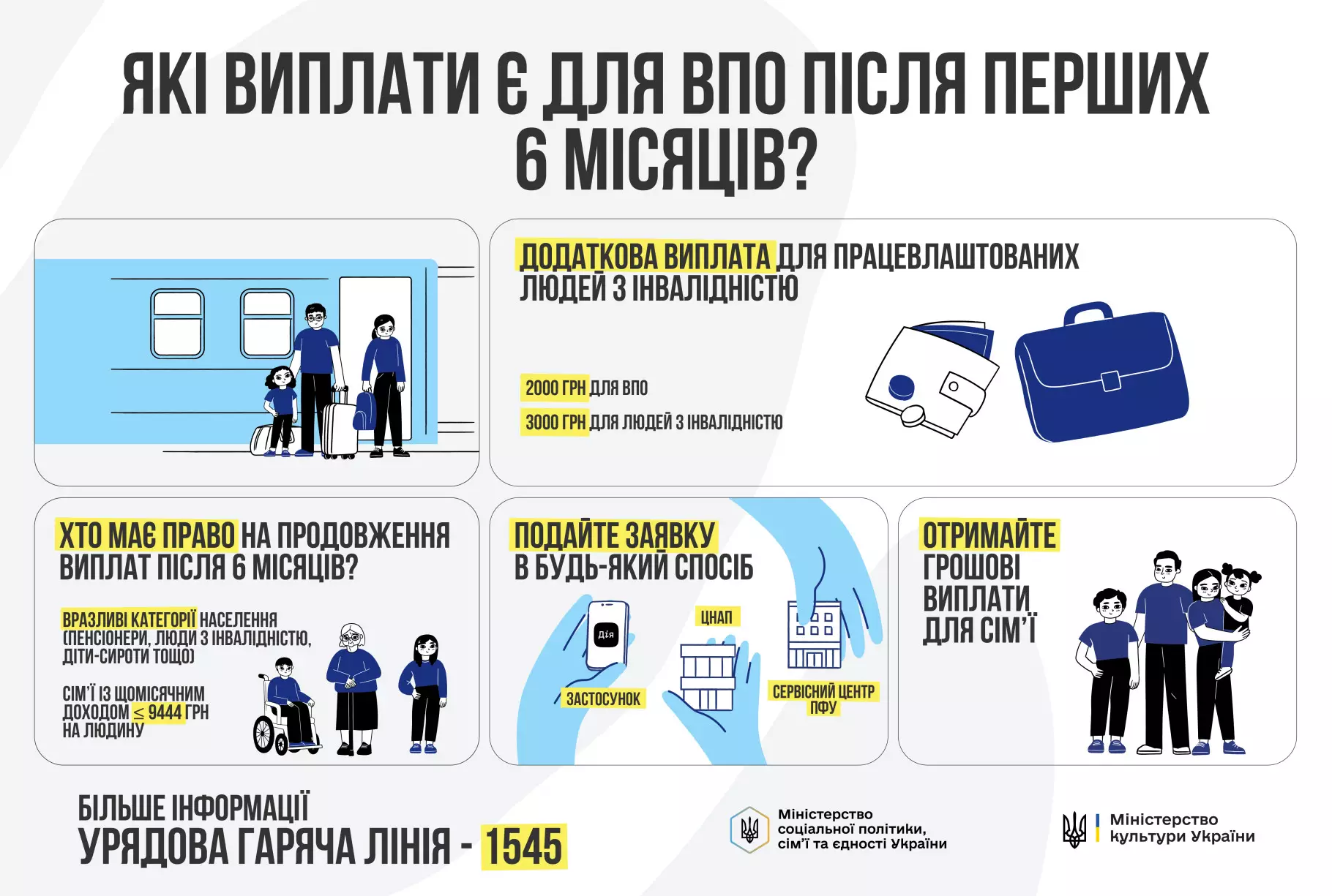 Міністерство культури України у співпраці з Міністерством соціальної політики, сім’ї та єдності України за результатами проведення мистецького конкурсу забезпечують проведення інформаційної кампанії щодо доступності соціальних послуг для внутрішньо переміщених осіб.