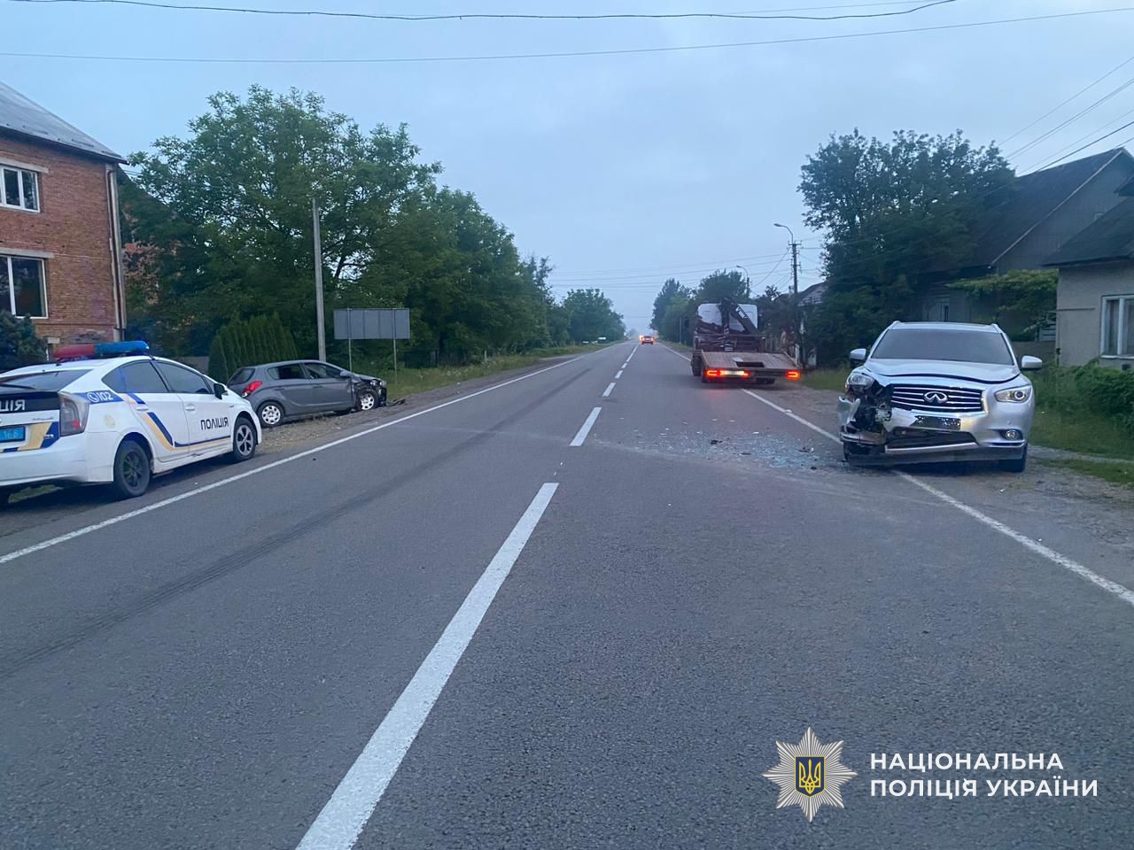 Друга аварія трапилася 2 червня опів на п`яту ранку в місті Тячів. Там 35-річна місцева жителька, рухаючись на автомобілі марки «Hyundai», зʼїхала за межі проїзної частини та допустила зіткнення з припаркованим на обочині транспортним засобом марки «Infiniti». У салоні авто «Hyundai» також знаходились 9-річний син водійки, 35-річна жителька селища Буштино та її 9-річна дочка.
