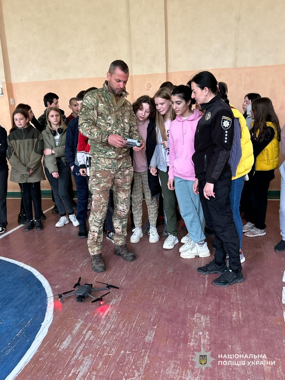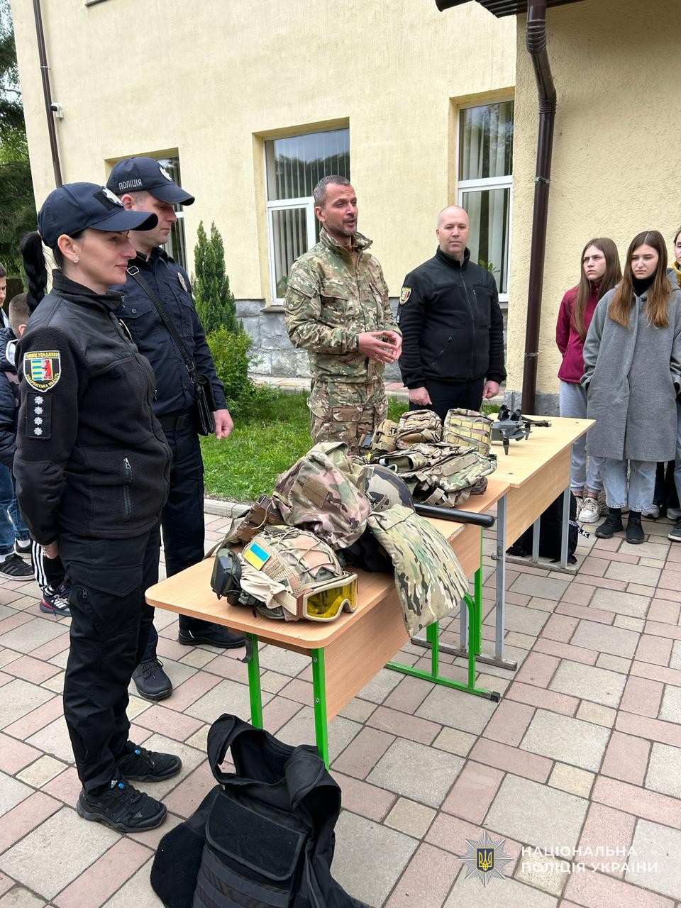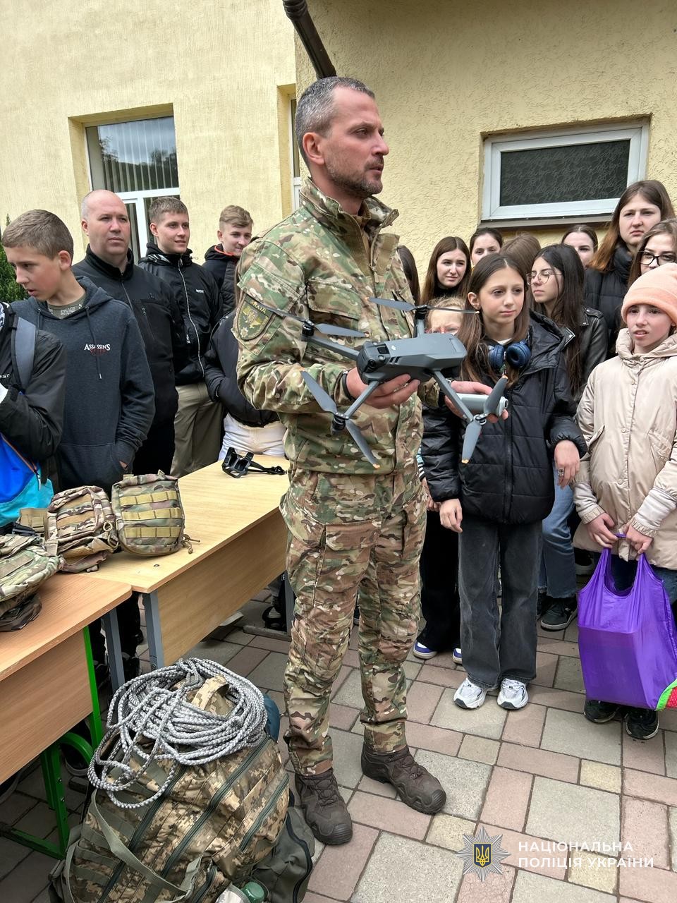 До заходу долучився й старший інспектор сектору ювенальної поліції Управління превентивної поліції Закарпаття Роман Король, який зробив урок ще цікавішим, адже приніс безпілотний літальний апарат. Правоохоронець розповів, як цей пристрій допомагав під час складних операцій під час перебування в зоні бойових дій та пояснив особливості керування ним.