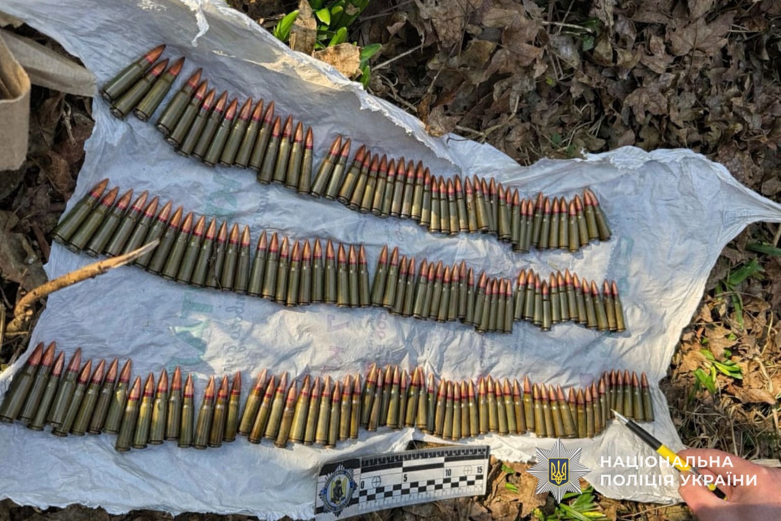 Під час огляду тайника правоохоронці вилучили кілька бойових гранат та майже 300 патронів до автоматичної зброї різного калібру.
