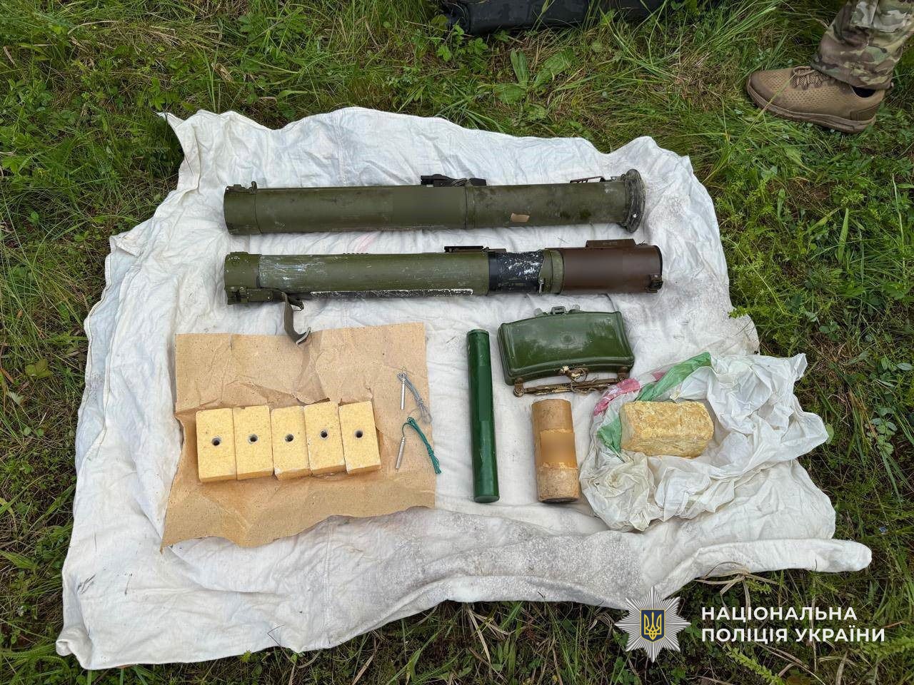 Також правоохоронці встановили, що неподалік місця затримання фігурант облаштував сховок. Звідти, у ході проведення обшуку, було вилучено 2 одноразові пускові установки пострілу гранатомета, 5 тротилових шашок, 2 електродетонатори, 1 протипіхотну міну, 1 маршовий двигун до гранатометного пострілу, вибуховий пакет та брусок пластичної вибухової речовини.