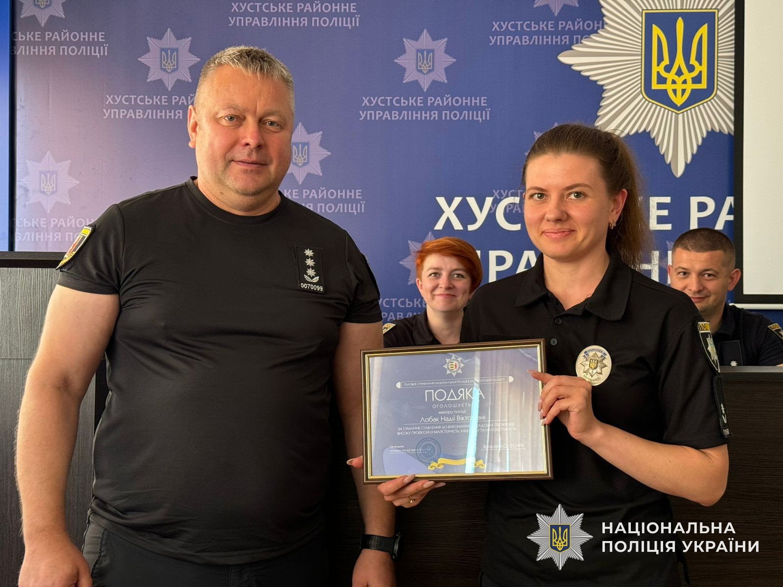 Окрім цього, під час круглого столу, начальник відділу службових розслідувань управління головної інспекції Закарпаття Олександр Софілканич за сумлінну працю та виконання функціональних обов’язків подякою начальника Головного управління Національної поліції в Закарпатській області відзначив інспектора дотримання прав людини Надію Лобак.