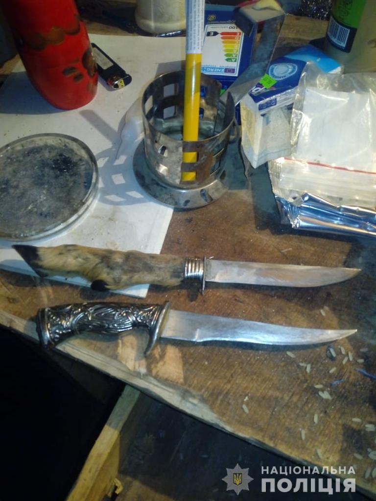 Під час обшуку правоохоронці виявили та вилучили два ножі з ознаками холодної зброї та предмет, схожий на бойовий запал військового взірця.