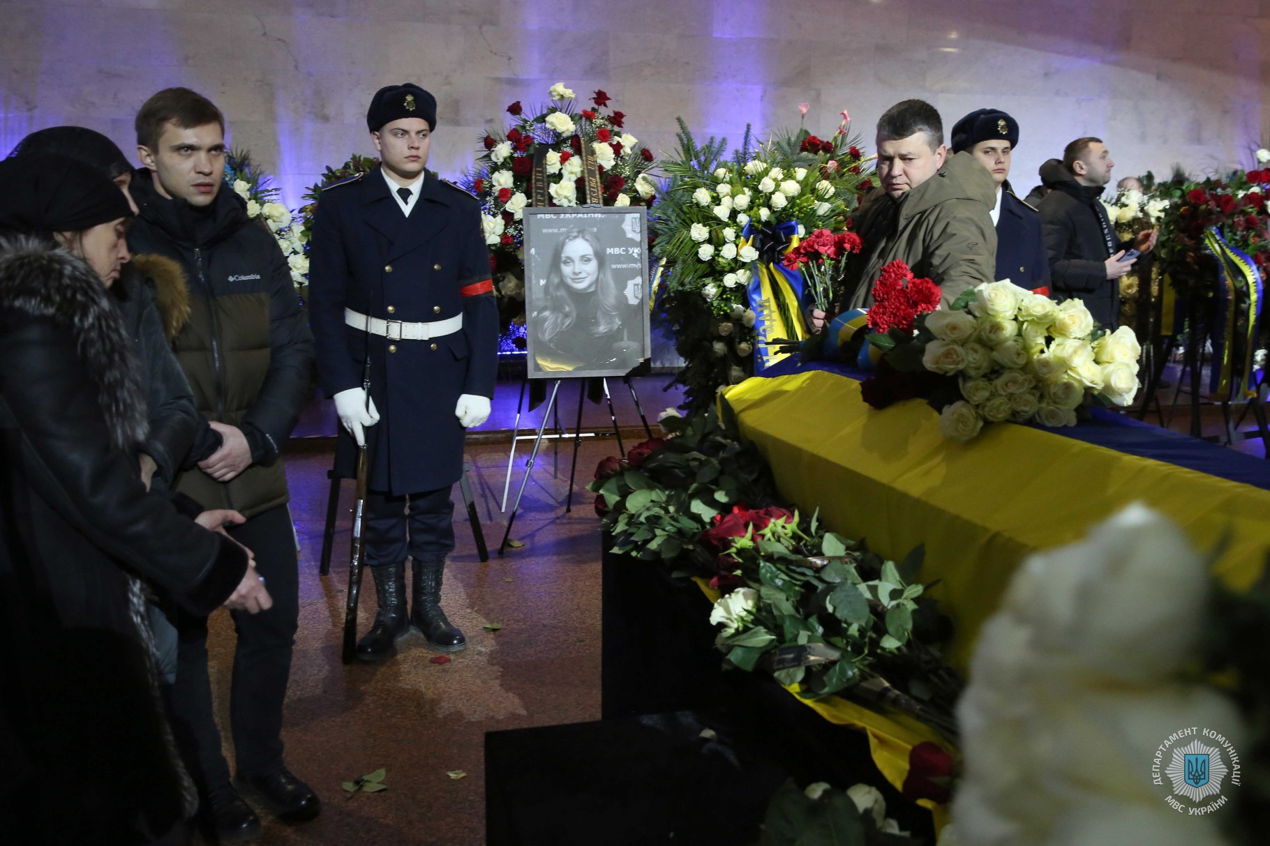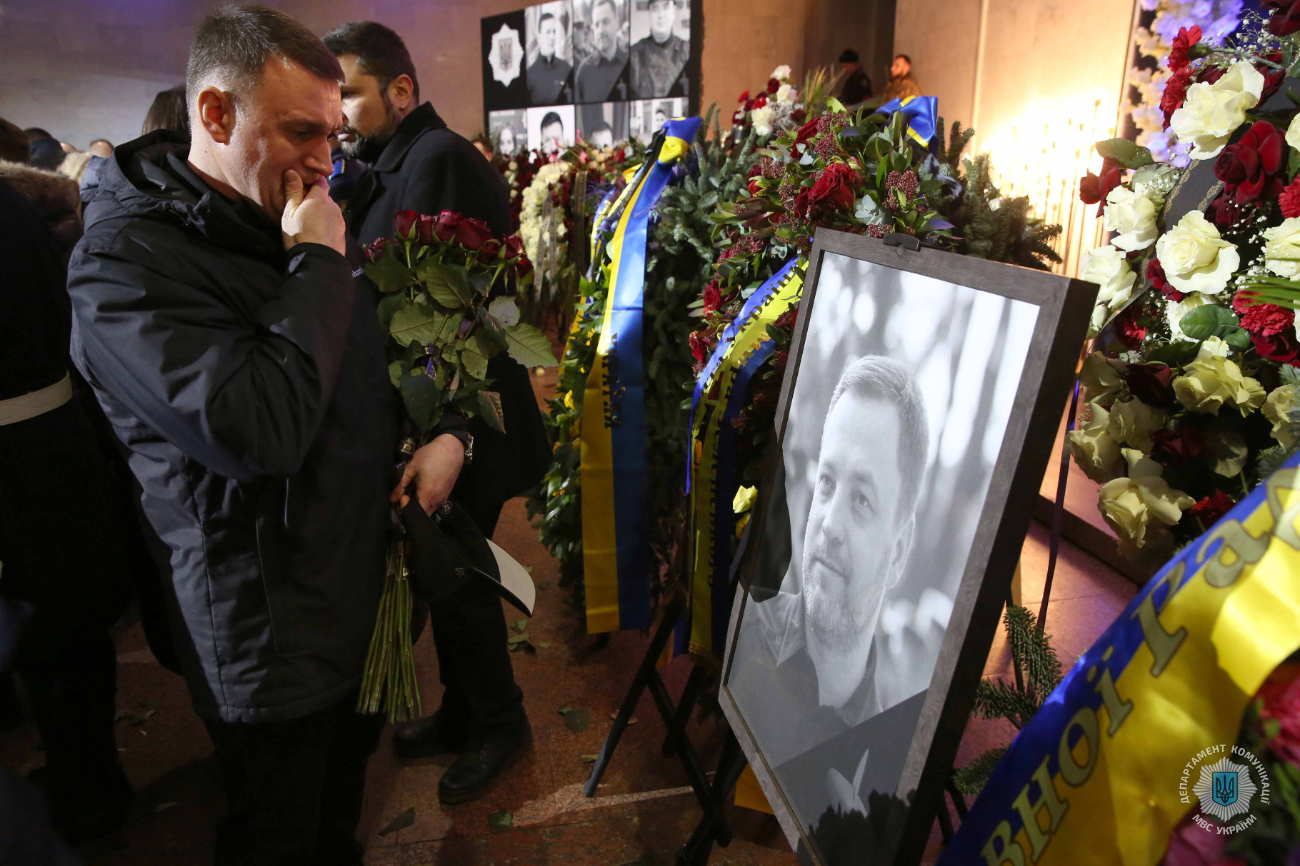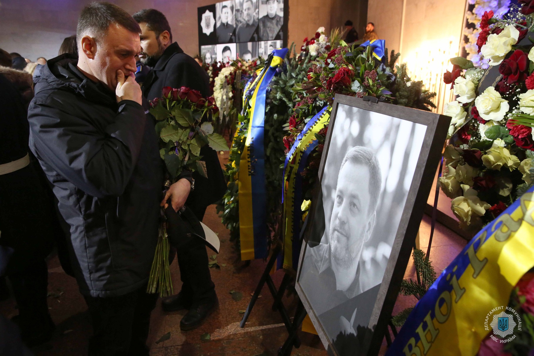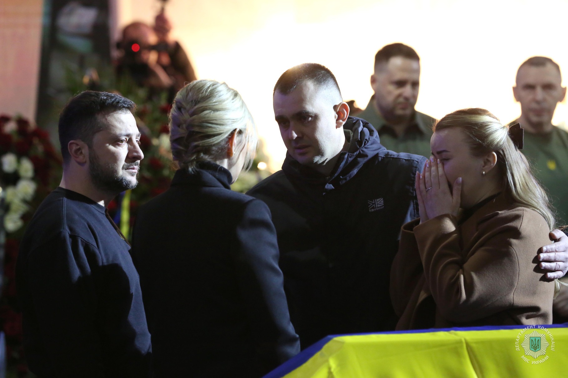 Зокрема, церемонію прощання з міністром внутрішніх справ Денисом Монастирським та іншими представниками МВС, які загинули внаслідок падіння гвинтокрила в Броварах 18 січня, відвідали Президент України Володимир Зеленський із дружиною, голова Верховної Ради України Руслан Стефанчук, голова Уряду України Денис Шмигаль, керівник Офісу президента України Андрій Єрмак, секретар РНБОУ Олексій Данілов та інші державні діячі. Всі вони висловили скорботні слова співчуття членам родин загиблих, їхнім друзям та колегам і однодумцям.