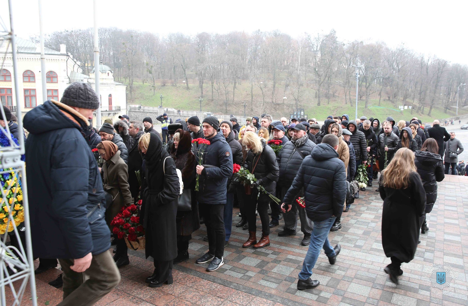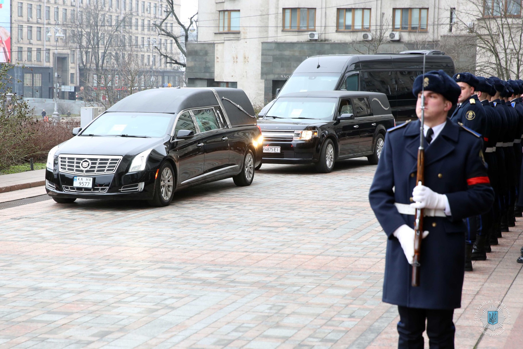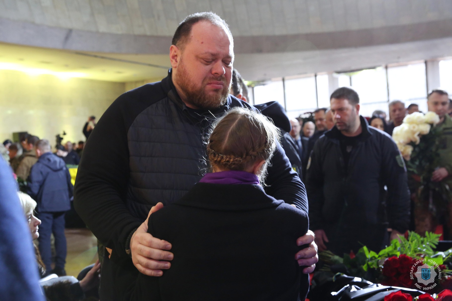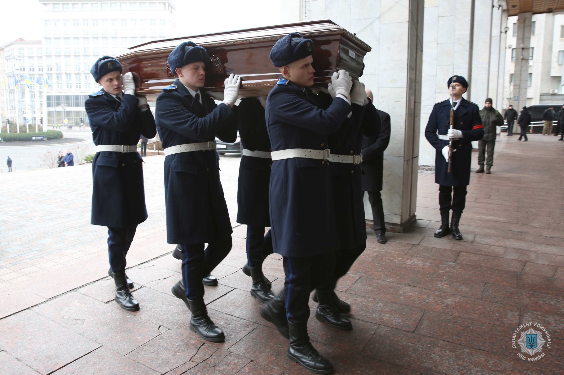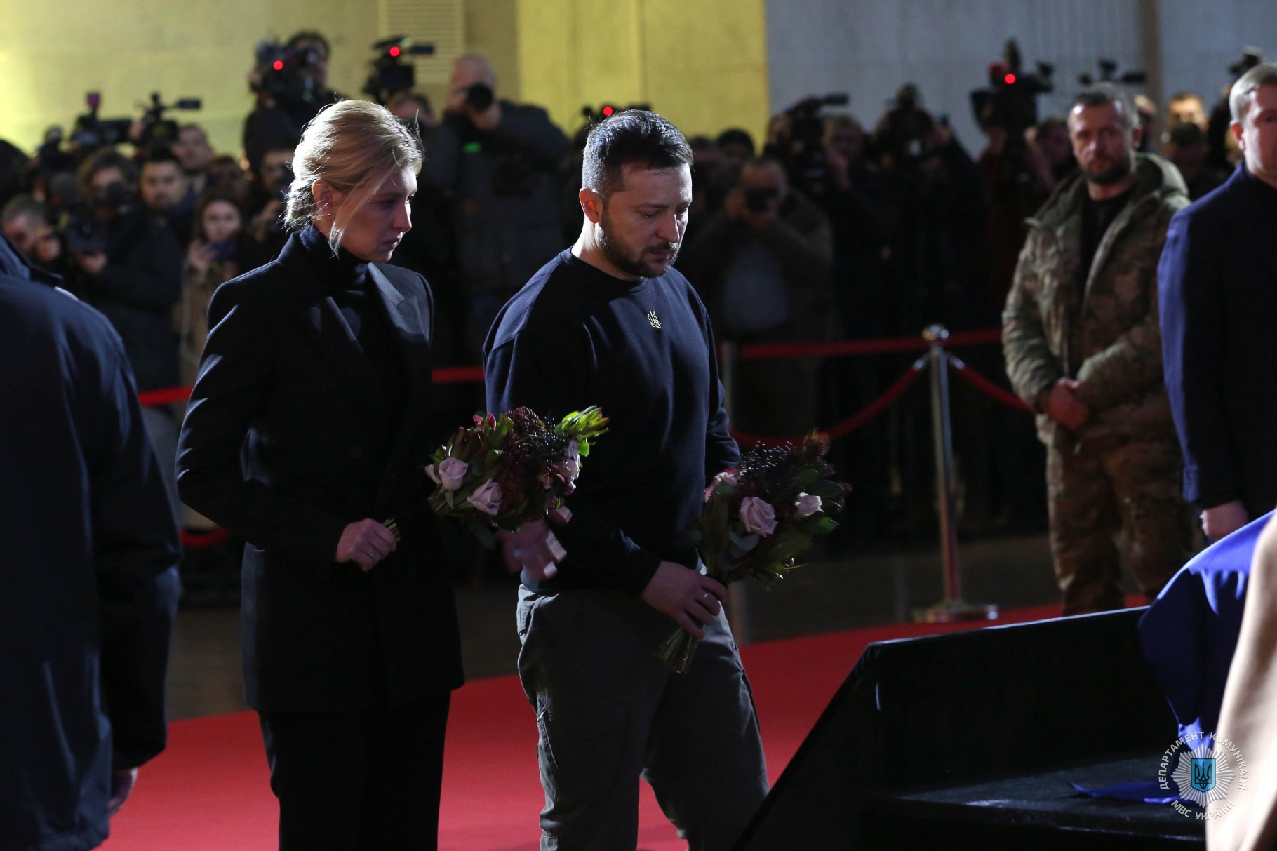 Зокрема, церемонію прощання з міністром внутрішніх справ Денисом Монастирським та іншими представниками МВС, які загинули внаслідок падіння гвинтокрила в Броварах 18 січня, відвідали Президент України Володимир Зеленський із дружиною, голова Верховної Ради України Руслан Стефанчук, голова Уряду України Денис Шмигаль, керівник Офісу президента України Андрій Єрмак, секретар РНБОУ Олексій Данілов та інші державні діячі. Всі вони висловили скорботні слова співчуття членам родин загиблих, їхнім друзям та колегам і однодумцям.