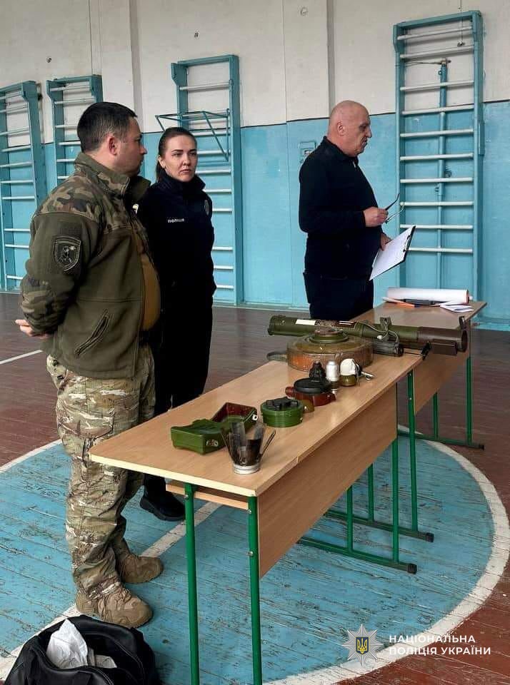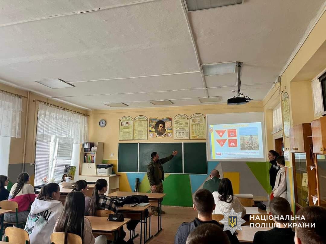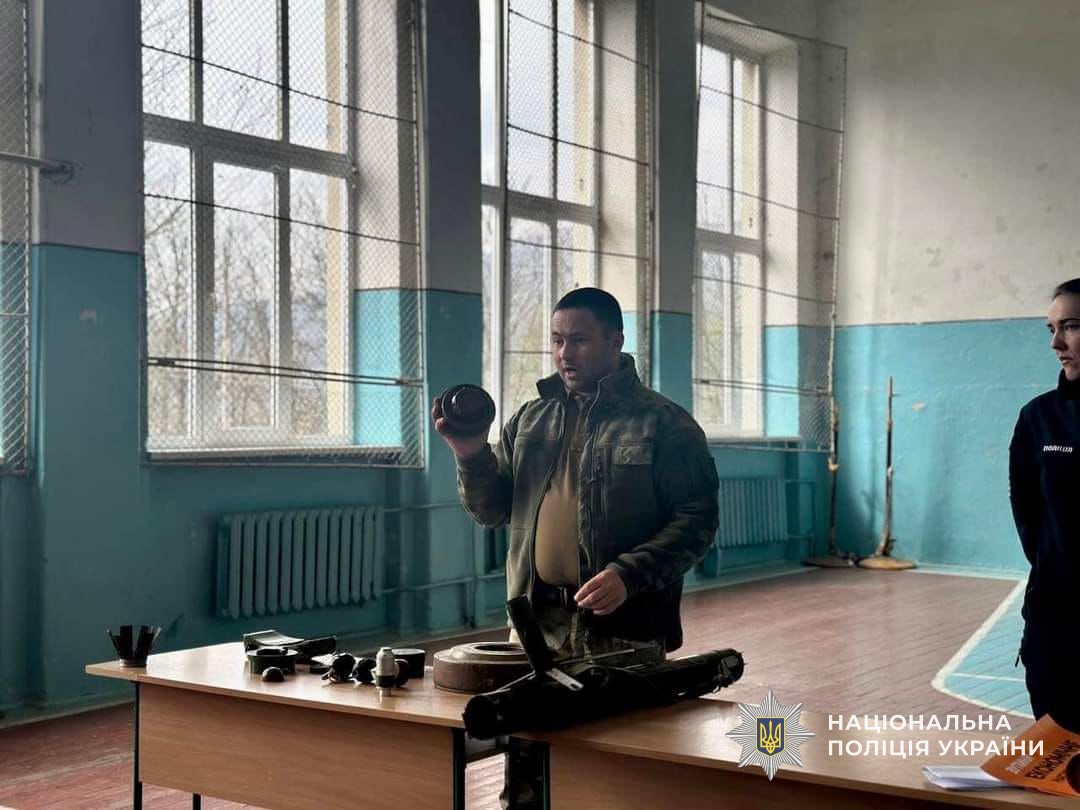 Далі ж, майор поліції зібрав хлопців та дівчат у спортивній залі навчального закладу, де наочно продемонстрував муляжі видів вибухонебезпечних предметів і акцентував, що чіпати такі знахідки категорично заборонено.