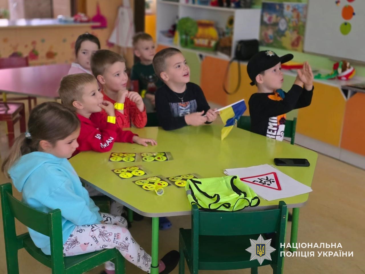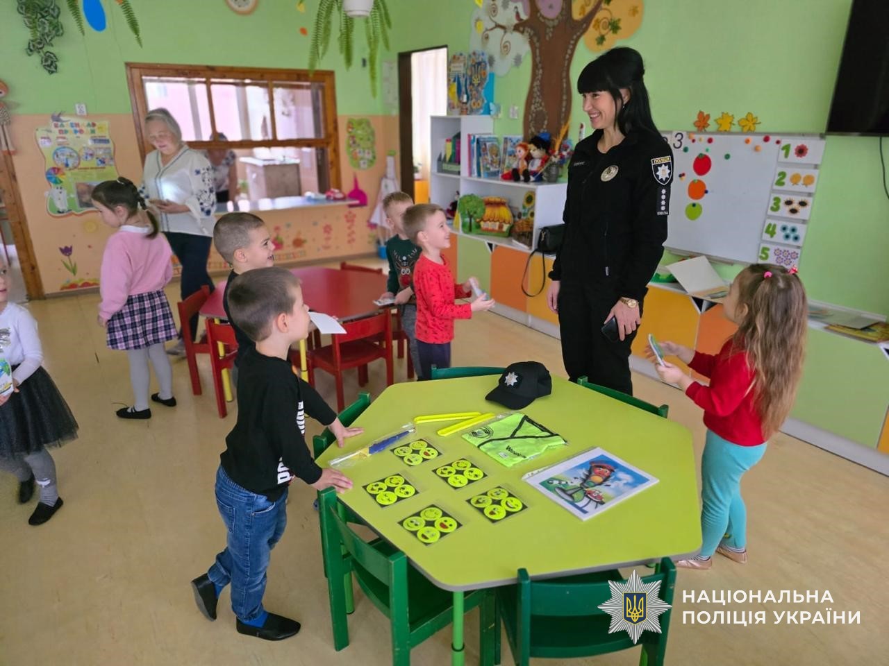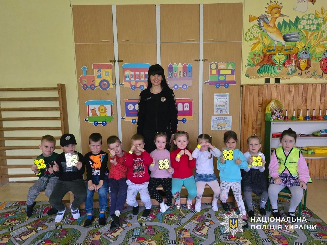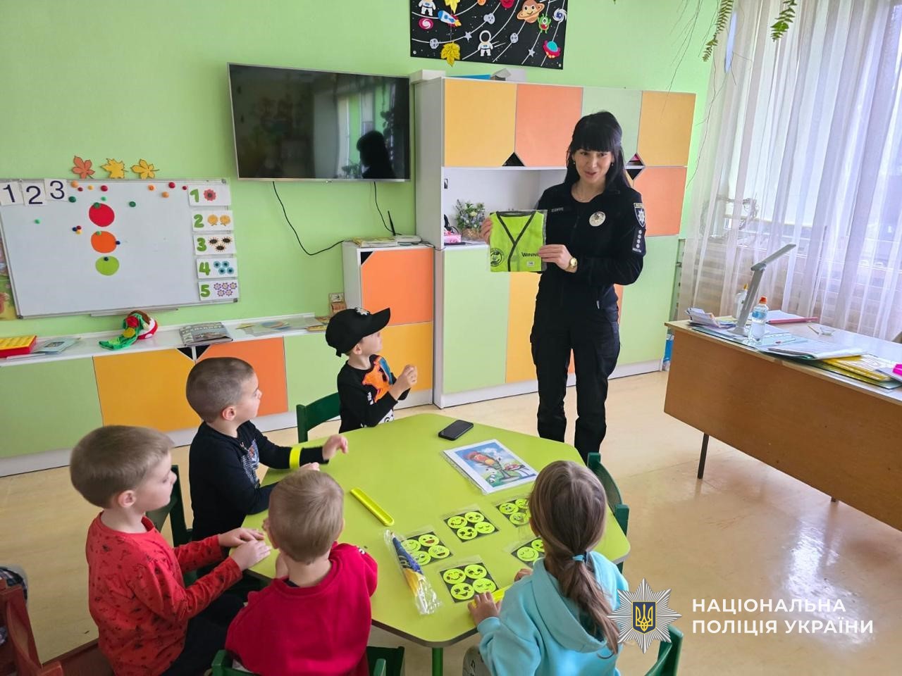 Поліцейська розпочала заняття зі знайомства. Потім, щоб зацікавити своїх маленьких слухачів, розклала тематичні ілюстративні малюнки та світлоповертальні елементи, які підготувала до зустрічі заздалегідь.