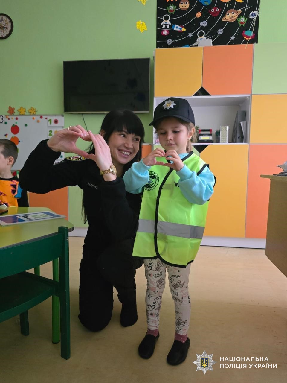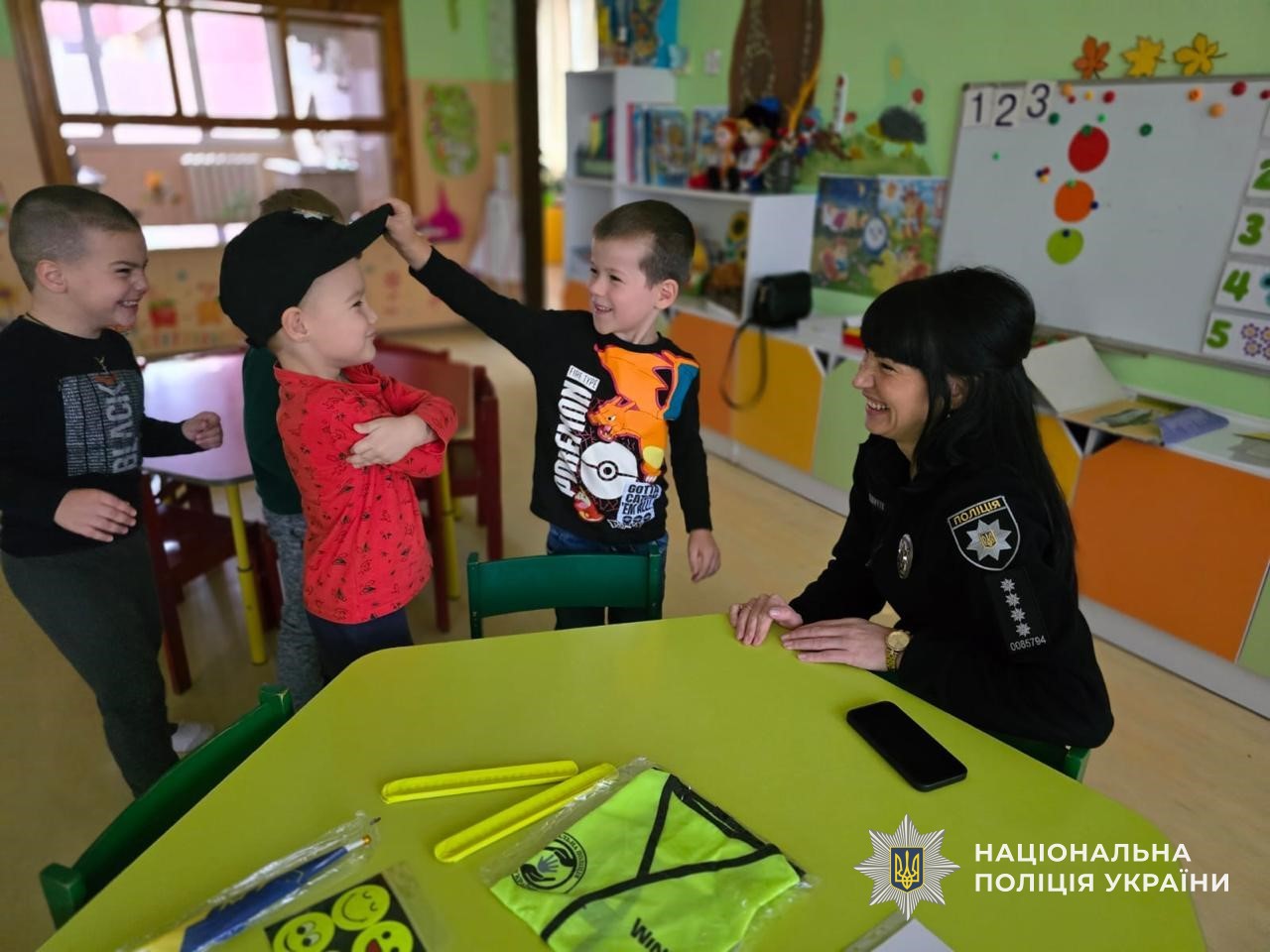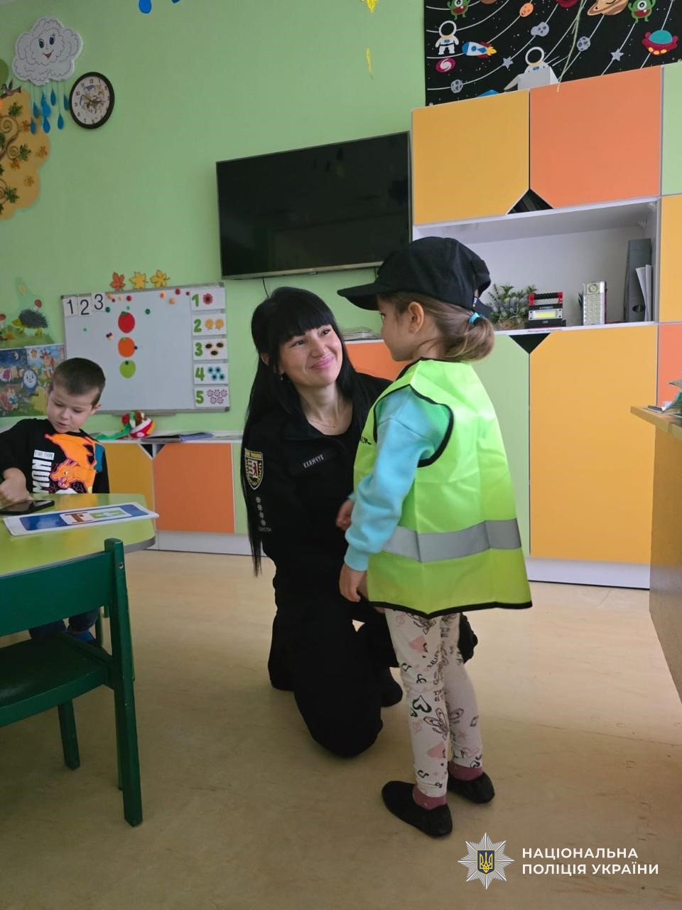 Поліцейська розпочала заняття зі знайомства. Потім, щоб зацікавити своїх маленьких слухачів, розклала тематичні ілюстративні малюнки та світлоповертальні елементи, які підготувала до зустрічі заздалегідь.