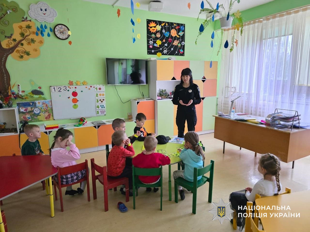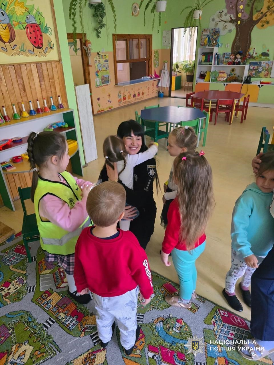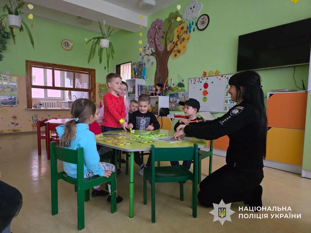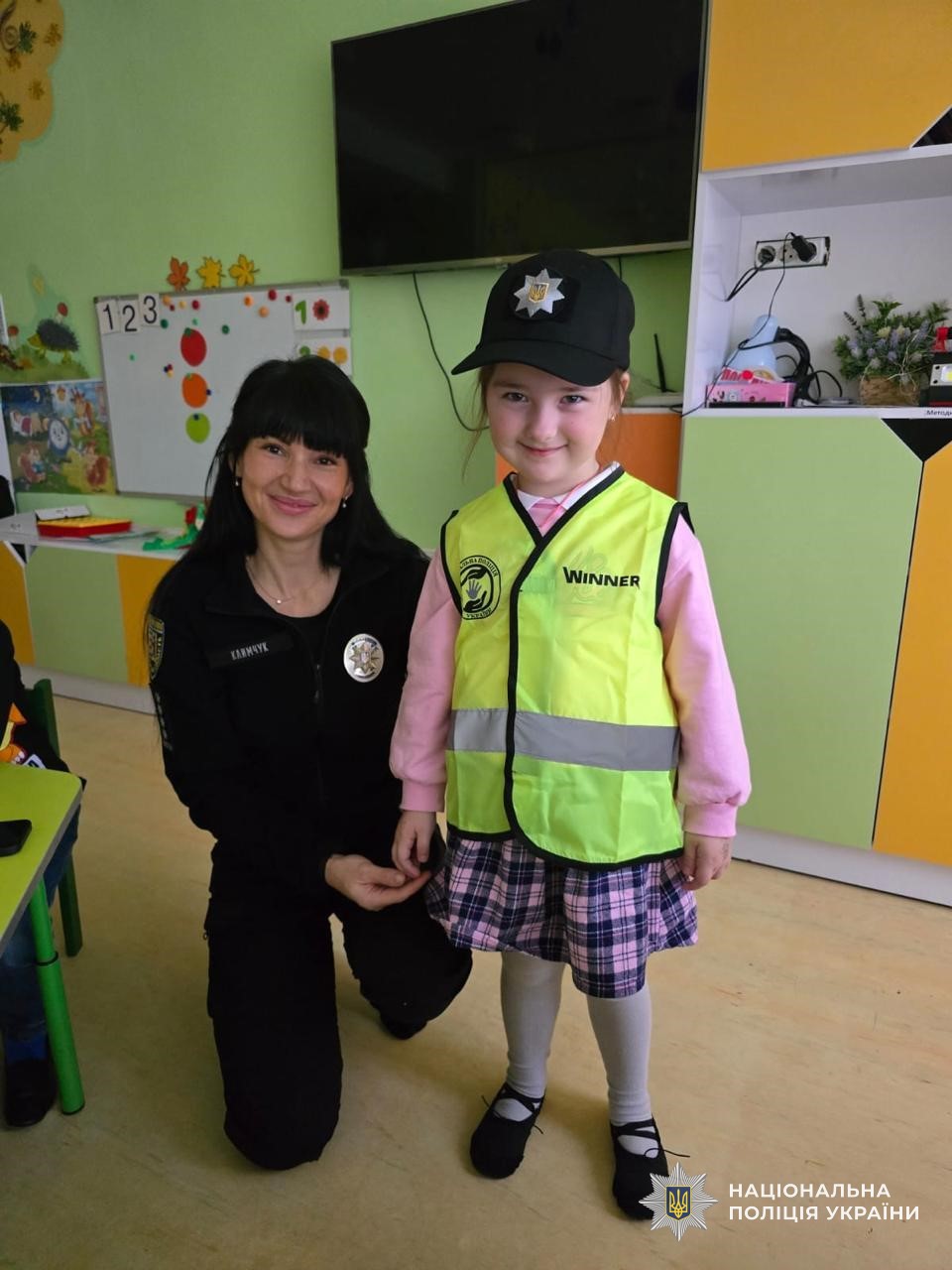 Поліцейська розпочала заняття зі знайомства. Потім, щоб зацікавити своїх маленьких слухачів, розклала тематичні ілюстративні малюнки та світлоповертальні елементи, які підготувала до зустрічі заздалегідь.