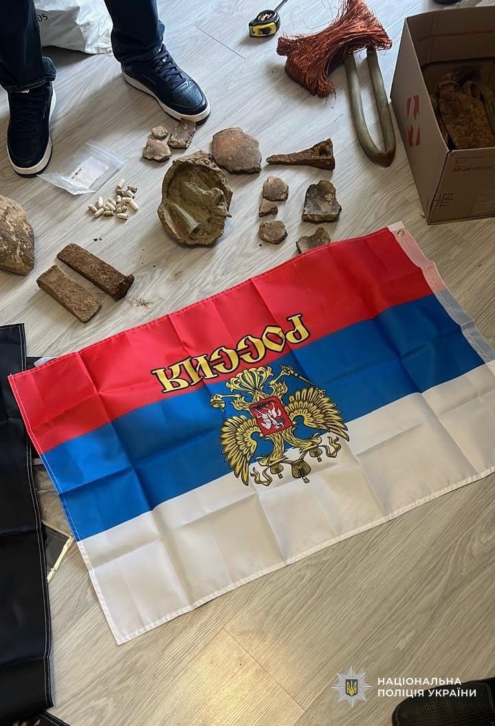 Загалом під час обшуку вилучено 72 прапори із символікою рф, майже 150 нашивок та шевронів з символікою армії країни-агресора, значки й ордени фсб рф та ссср. Також вилучено чотири старовинні бронзові сокири-кельти та інші предмети, що мають культурну й історичну цінність.