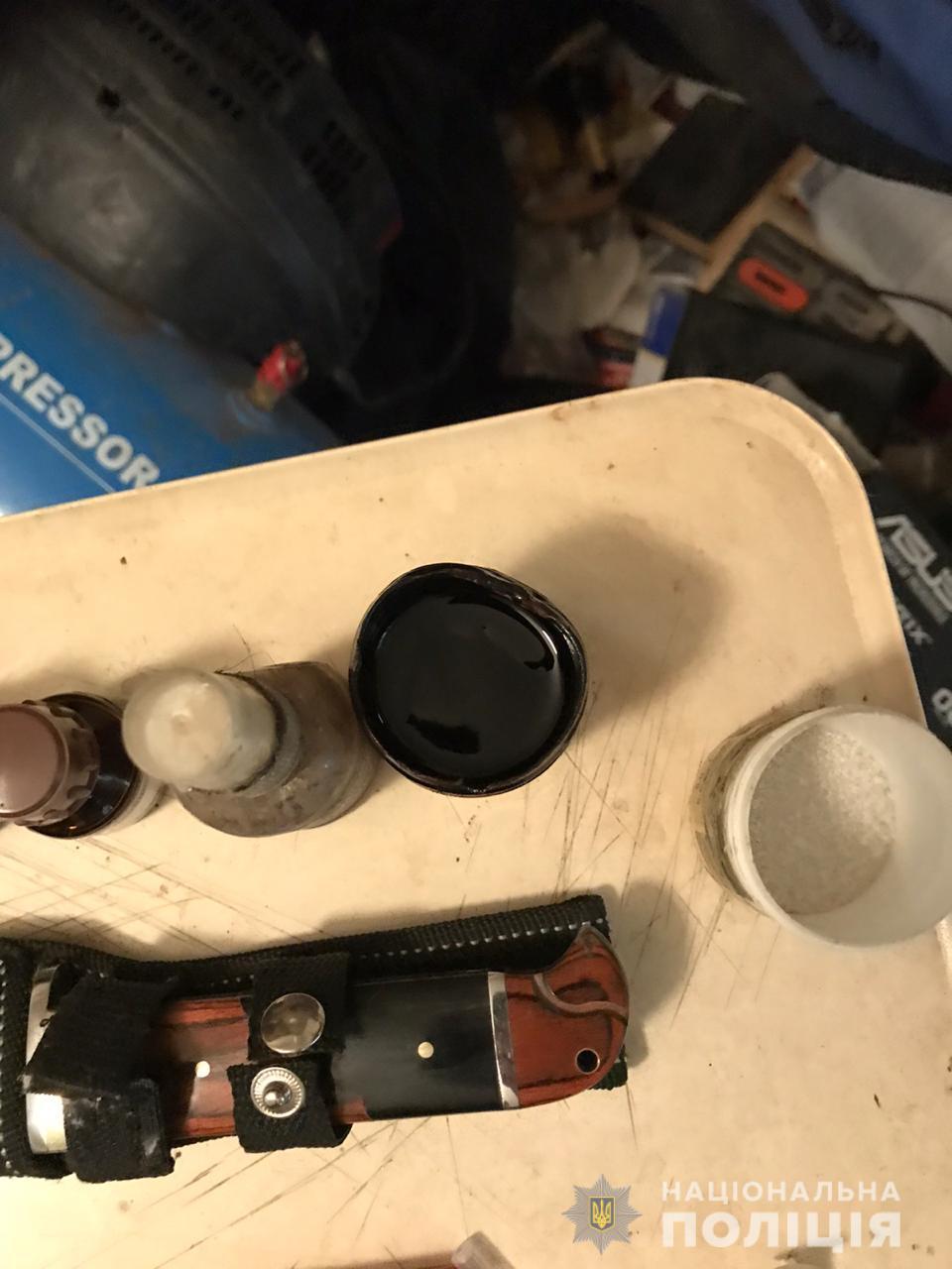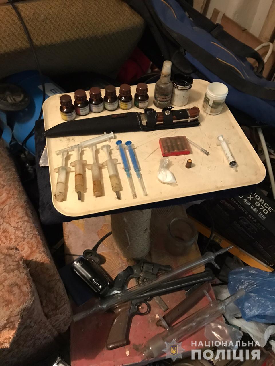 Зокрема, в квартирі 54-річного чоловіка, в якій разом з ним перебував його товариш, виявили понад десяток шприців, деякі з них вже були наповнені рідиною та із запаяними носиками. Також в квартирі знайшли пакет з білою кристалічною речовиною, ємність з рідинами невстановленого походження, пакунок з розсипчатою речовиною та ємність з чорною смолоподібною речовиною. Окрім цього було виявлено дві одиниці зброї.