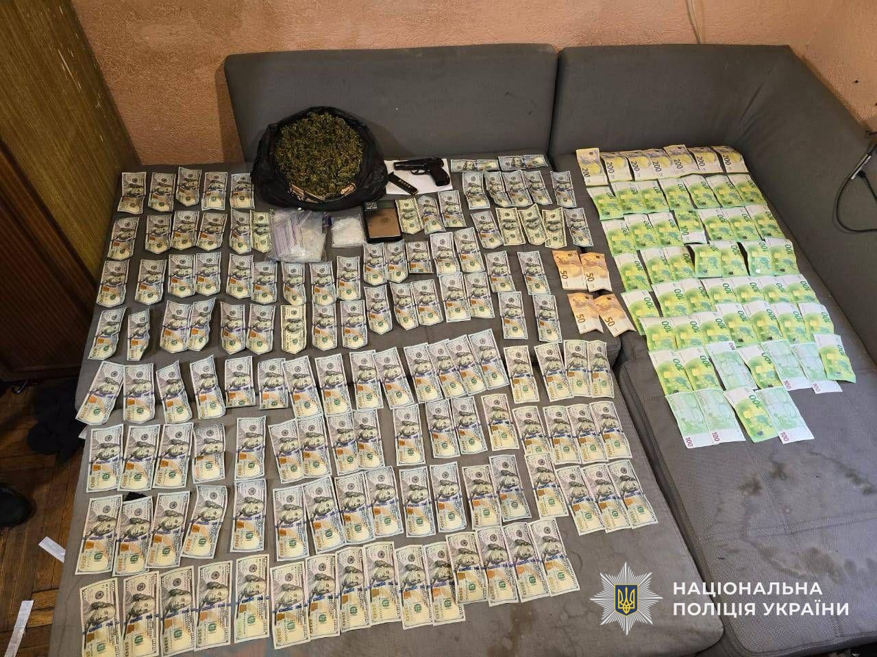 У ході обшуку вилучили понад 70 грамів метамфетаміну, 2,5 кілограми марихуани, а також гроші, здобуті злочинним шляхом — 12 000 доларів, 8 000 євро та 40 000 гривень. Загальна сума вилученої готівки, за курсом НБУ, сягає понад 900 тисяч гривень. Більшу частину наркотичних речовин та коштів було знайдено у помешканні організатора групи.