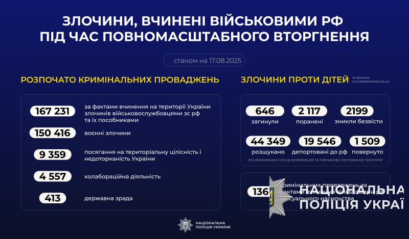 З початку повномасштабного вторгнення росії в Україну слідчі Національної поліції України розпочали 167 231 кримінальне провадження за фактами вчинення на території України злочинів військовослужбовцями збройних сил російської федерації та їхніми пособниками.